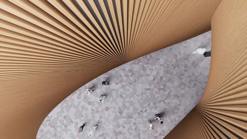 All visitors walk into the pavilion along a surface covered with Finnish granite. The central gorge space boasts curved wooden surfaces. It is a sculptural space inspired by Finnish nature, ideal for meeting someone face to face. It is also a multifunctional space for events and activities, as well as the key space for greeting visitors.