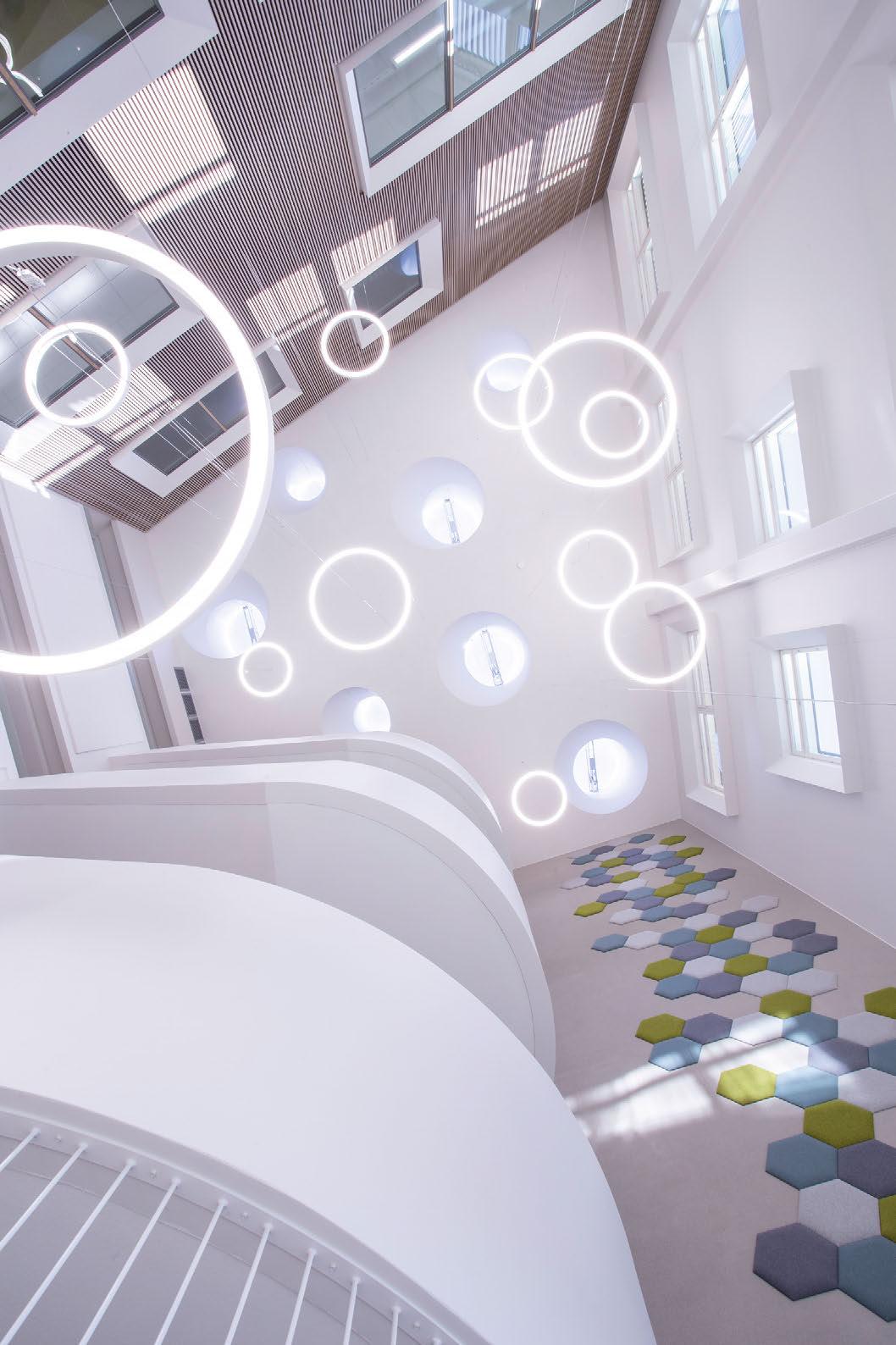 The interior underwent a significant modernisation, while still maintaining the original atmosphere of the building. A new open staircase was designed for the main area to connect the facilities across six floors. The facilities were modernised with respect for the timeless values entailed in the building, yet also meeting important current objectives. The project was awarded the LEED Gold Certificate.