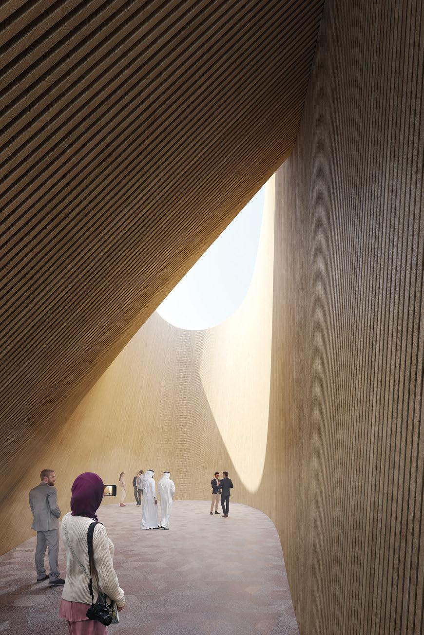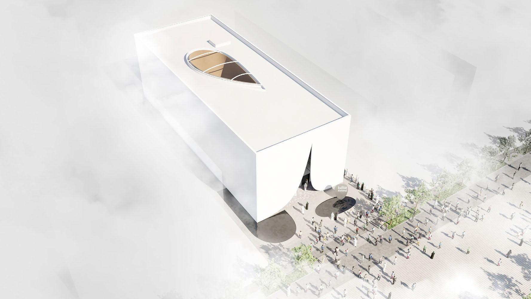 The Finland Pavilion building visually incorporates both Finnish and Arabic cultures. The exterior of the pavilion is as white as snow, and the entrance gives an impression of arriving in an Arabic tent. The Finnish natural design and innovation are combined with Arabic visual features. The Finnish pavilion is a meeting space - the "Finland Majlis" - a tent where connections between Finnish and Arabic minds can be fostered.