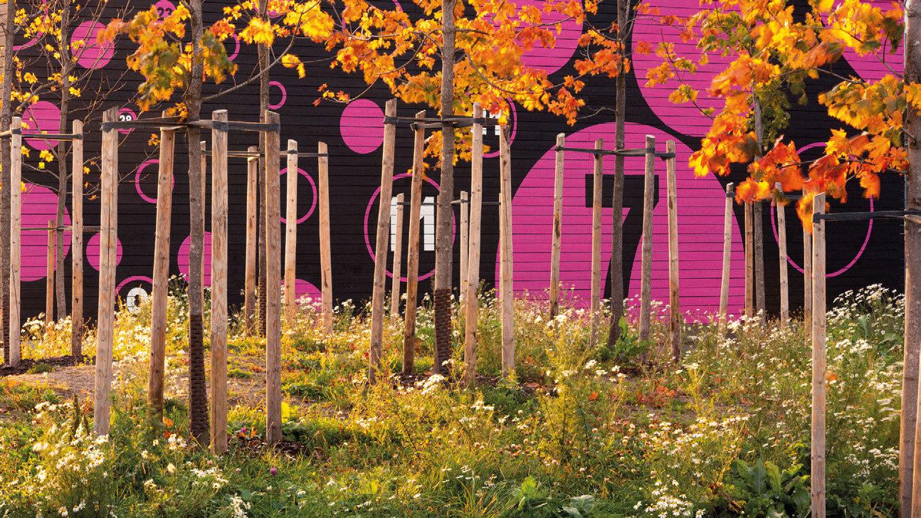 The activity areas – which have steel wire mesh fencing and which are embedded in the shape of the terrain – form transparent cylinders in the centre of the park. The park boasts a daycare centre, a dog park, as well as play and sports areas. The vegetation is abundant and trees have been planted, in places, very close to each other, as the idea was to create an atmosphere of a local forest.