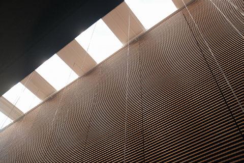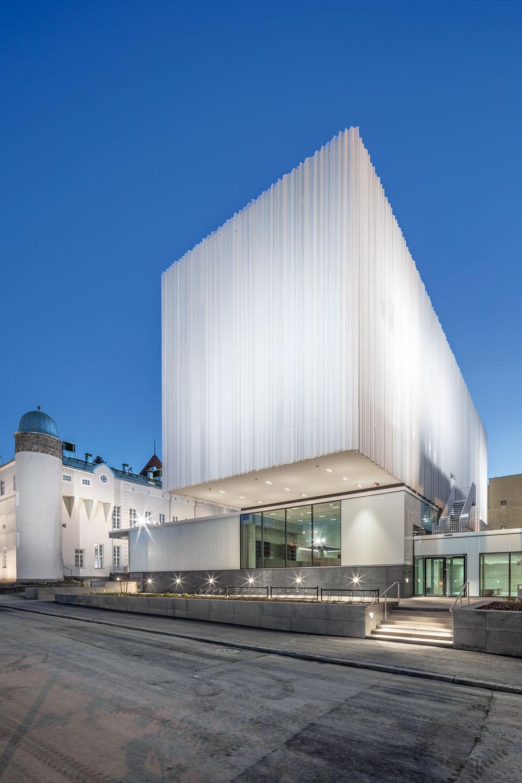 The views opening into and from the building play a key role. The foyer is filled with light. A large glass wall, as well as timber pillars and beams, form an important part of the architecture. On the entrance floor, the material used in the ceiling is timber battens, and lighting fixtures have been arranged in between the timber battens. In the cloakroom, the ceiling and lighting fixtures transform into a wall. Wooden stairs run to a high exhibition space on the second floor. The impressive element in the space is a green wall covered with moss, which can be studied from various angles.