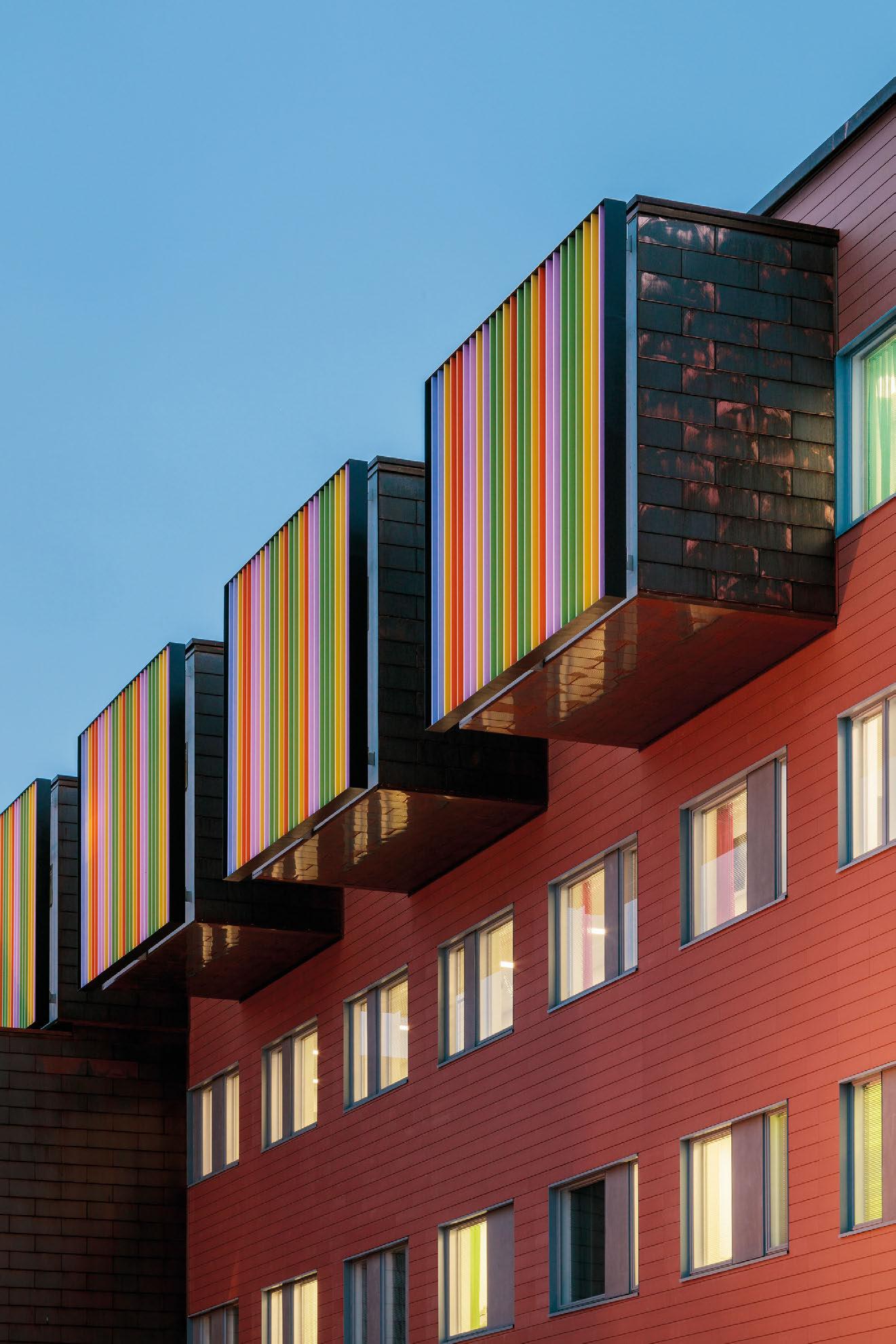 A particularly satisfying aspect of the process for us architects was the involvement of artists from the early planning phases onwards, which meant that we were able to integrate the art into the architecture. All of the new buildings contain works of art both inside and out. The Tampere Region is a theme that is carried through the pieces, which is also seen in the motifs and colours of the large-format prints used in the interior design.