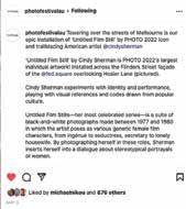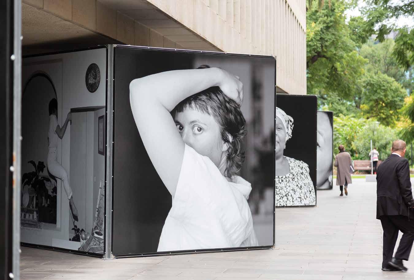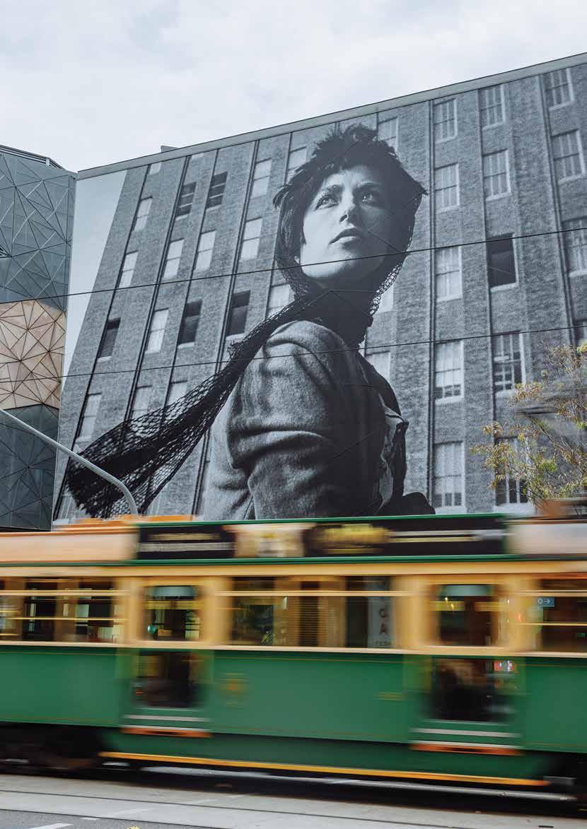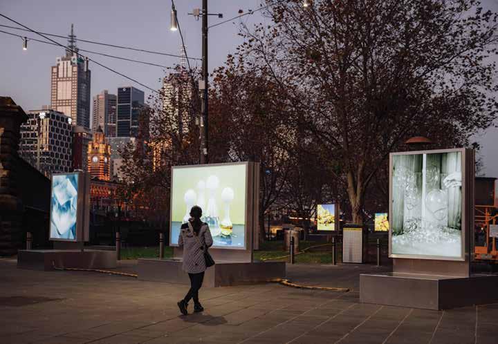 For PHOTO 2022, we were thrilled to introduce a new Icons stream, de signed to acknowledge and celebrate the world’s greatest and most influen tial photographers. The Jewish Museum presented an exhibition celebrating the life and work of Helmut Newton, in partnership with the Helmut Newton Foundation in Berlin, and we honoured Cindy Sherman with our largest ever artwork on the façade of Fed Square.