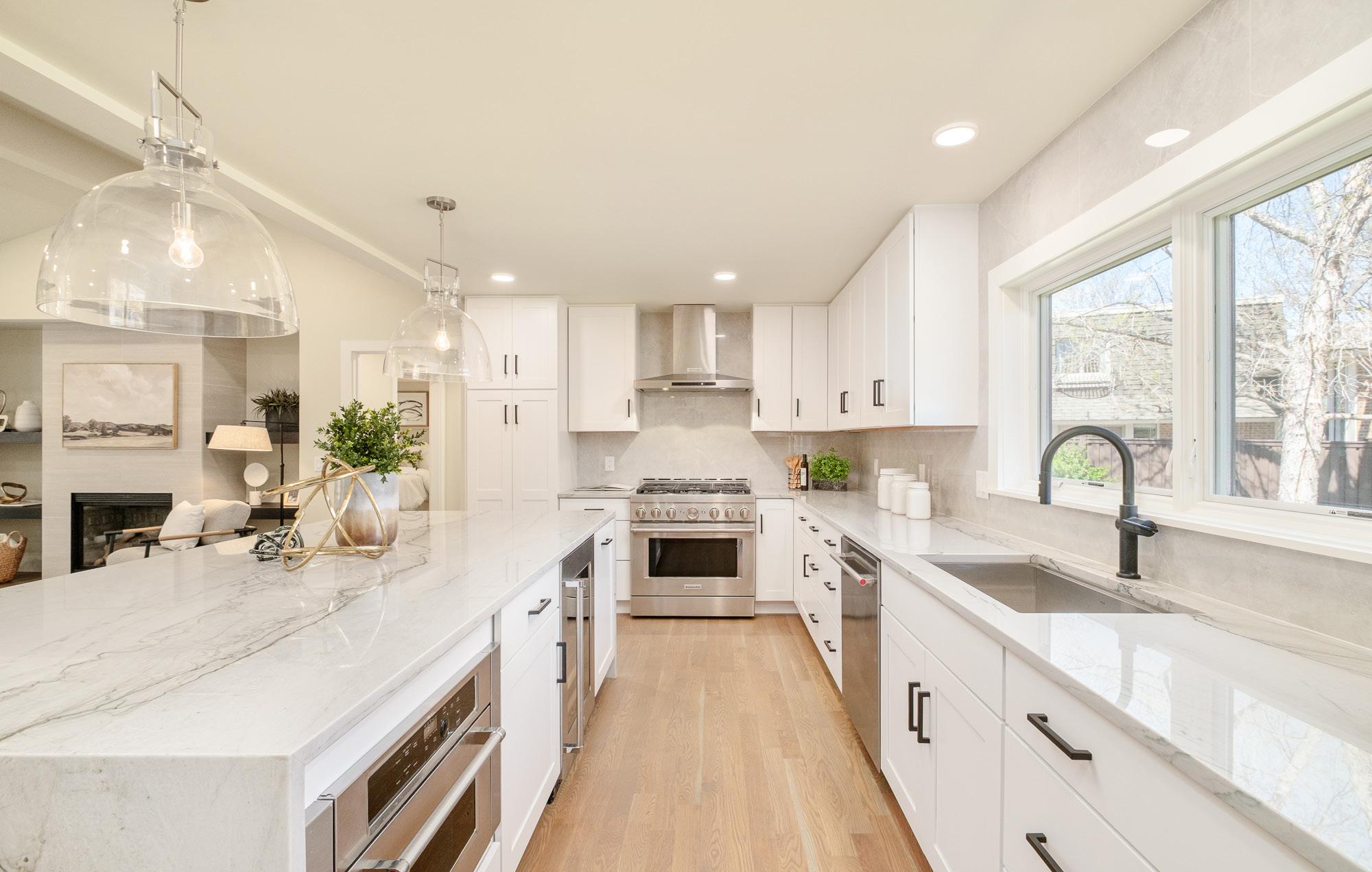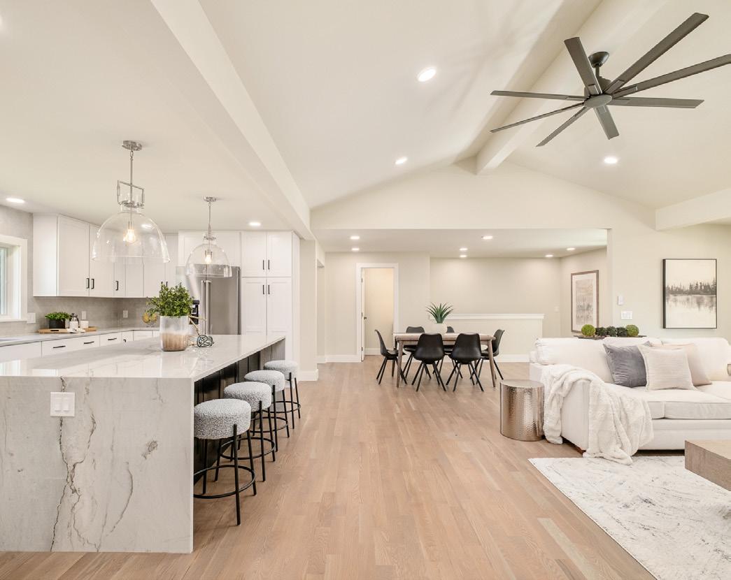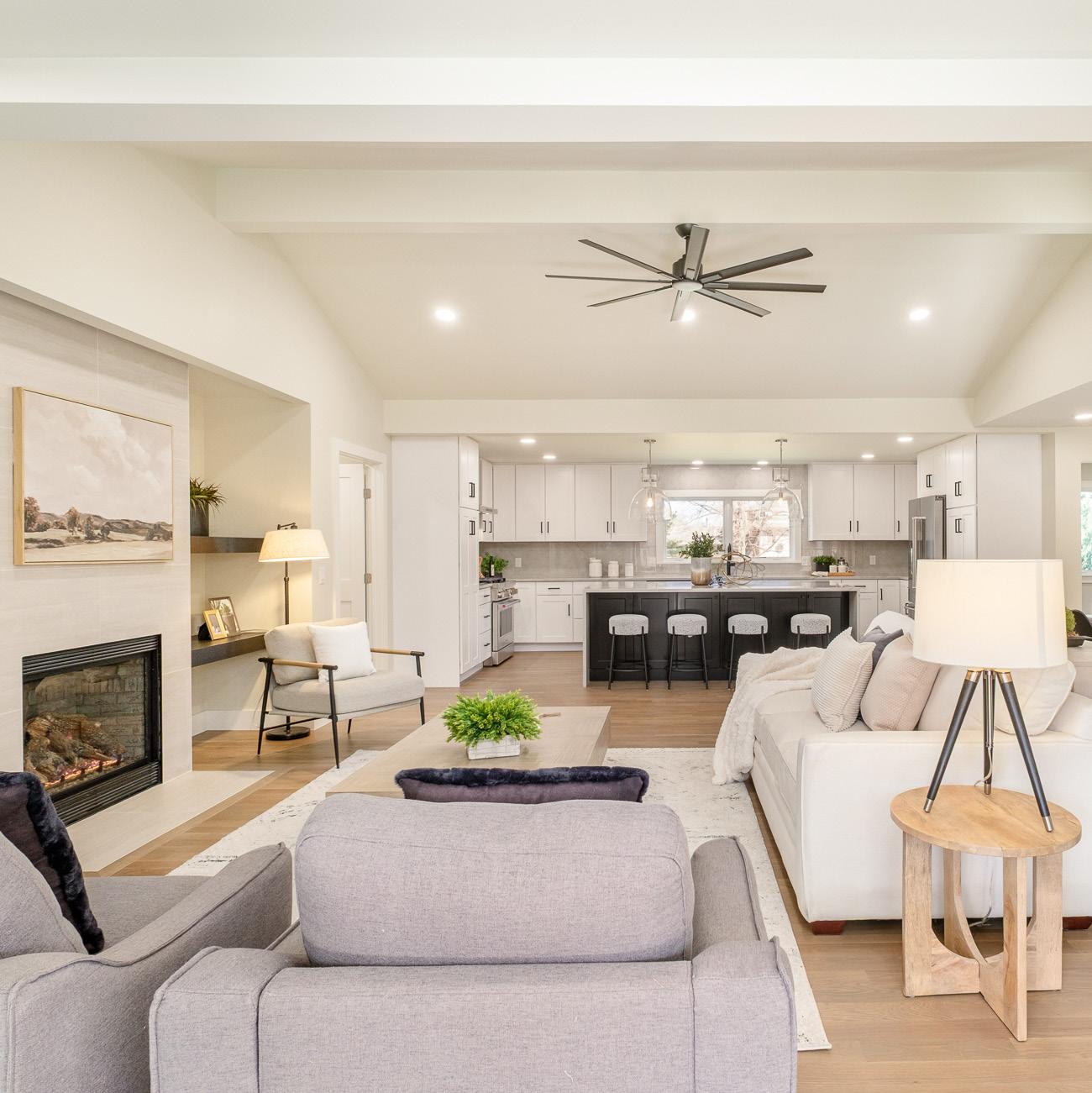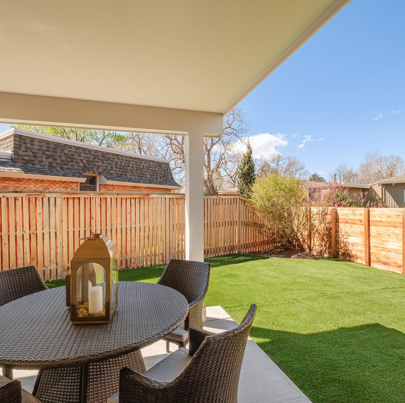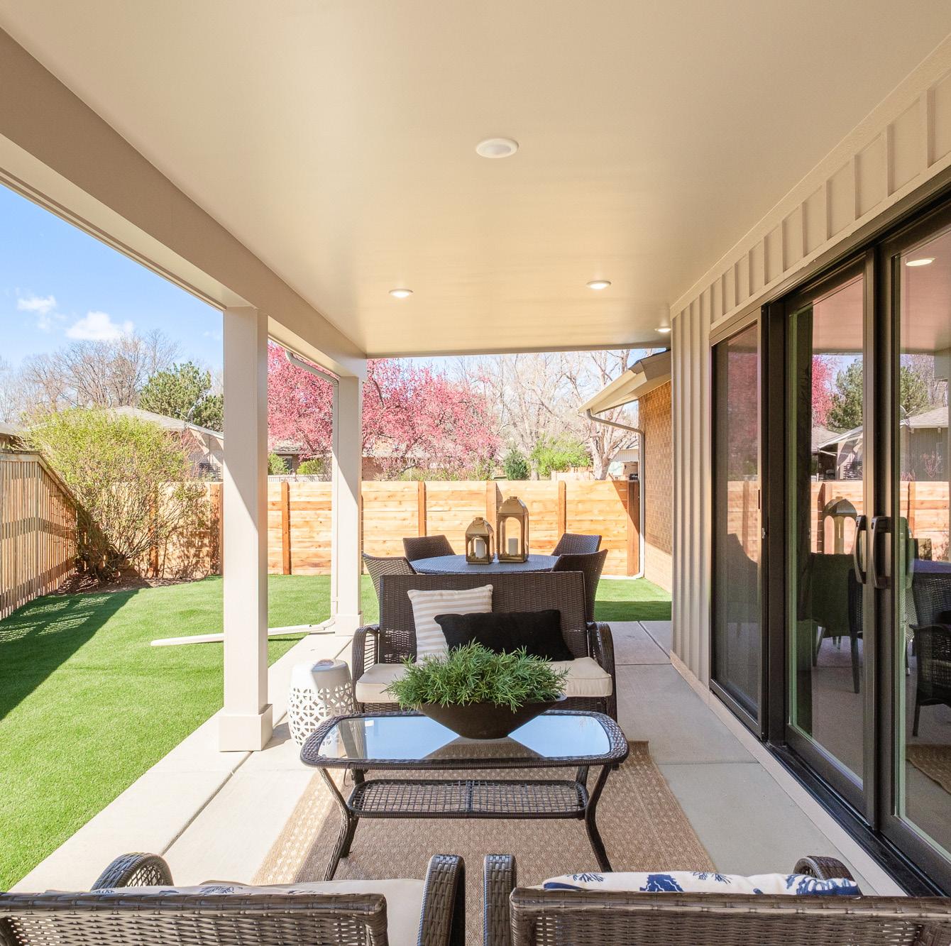 Perfectly positioned along a tranquil greenbelt and backing to the prestigious Columbine Country Club, the home is surrounded by multiple fenced outdoor spaces— ideal for both quiet relaxation and effortless entertaining. Completely renovated down to the studs and thoughtfully reimagined, the interior showcases exceptional craftsmanship and sophisticated design throughout. A calming palette of soft, neutral tones creates a warm, cohesive ambiance, while the expansive great room is filled with natural light, highlighted by vaulted ceilings and a striking gas fireplace.