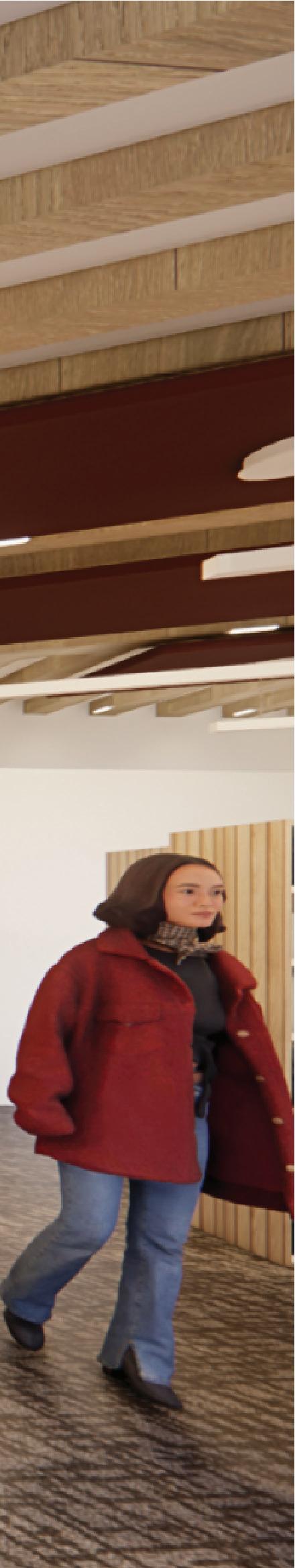 Circulation through the library mimics the experience of walking through woodland trails subtle angles and shifts in perspective guide visitors gently from one area to the next. Spaces open �gradually, offering moments of stillness and discove ry. Views of the outdoors surround the exterior of the building, pulling in natural light and reinforcing a constant connection to nature. The Canopy is a retreat, a learning ecosystem, and a living testament to Portland’s identity as a city that thrives in harmony with its forests.