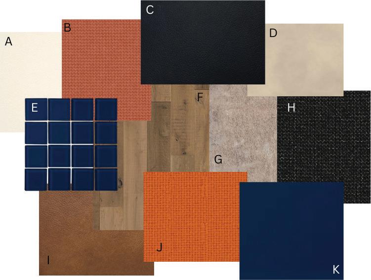 This material board reflects the intersection of Los Angeles’ pop culture, music industry, and professional legal environment. Dark polished materials establish authority and sophistication, while gold and brass accents reference the glamour of Hollywood and the music world. Electric blues, oranges, and muted reds introduce energy and creativity, balanced by warm whites and creams to maintain a bright, welcoming atmosphere. All resulting in a professional yet dynamic space rooted in LA’s creative identity.