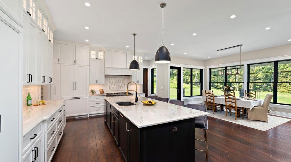 Blending modern amenities with classic details, typically associated with older homes, the residence boasts high ceilings throughout, designer fixtures, numerous large windows, custom eight-foot mahogany bedroom doors, and lowmaintenance wide plank hickory wood flooring. Black-framed Pella windows establish an elegant contrast, accenting the white custom cabinets in the kitchen. Open to a large dining area with peaceful views of the nature preserve, the kitchen also offers a center island with quartz countertop, dual Bosch dishwashers, soft-close cabinetry and high-end Thermador appliances, including a Thermador professional grade six burner gas range.