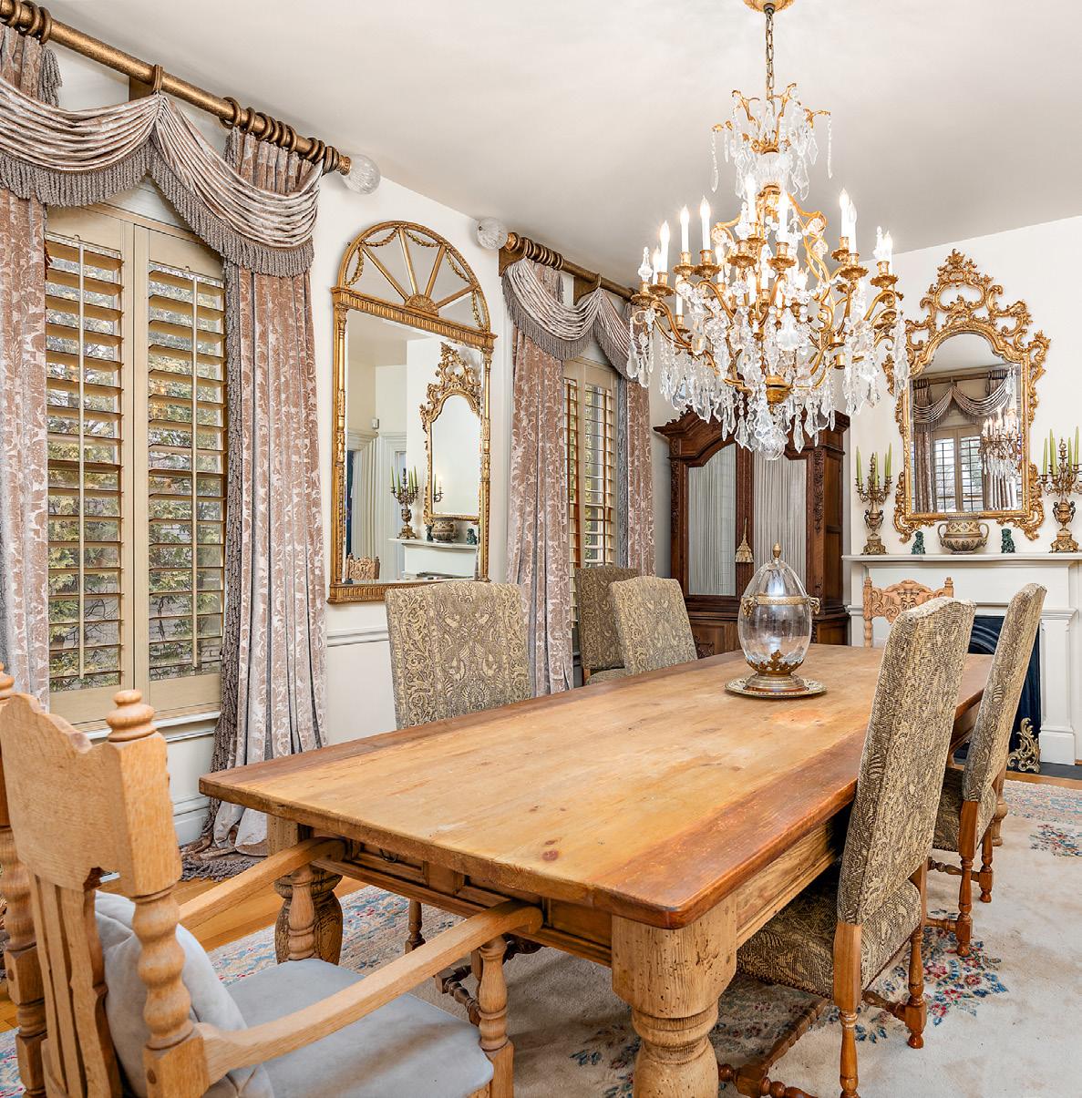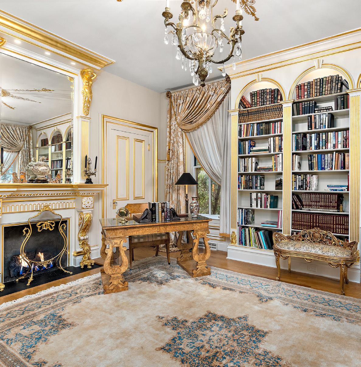 Inside, you will be in total awe of the elaborate details of this 4,000 sq. ft. residence. The entry features 14 ft. ceilings and beautifully restored original hardwood floors, as well as 3 of the estate’s 38 chandeliers and sconces sourced from around the world. The main floor consists of a stunning library enhanced with gold leafing gilded by Pittsburgh-based artist Youssef Kadri; a living room with a breathtaking platinum medallion and one of four working fireplaces; a large dining room with antique mirrors adorning its walls, perfect for hosting large dinner parties; a large TV room leading to a private back porch which looks down on the backyard gardens, and a custom high-end kitchen with Sub-Zero and Wolf appliances, double bullnose granite countertops with matching backsplash, and handmade cabinets reaching to the ceiling. The opulence continues onto the second floor, where you will find four spacious bedrooms, two full baths, and unobstructed views of the city.
