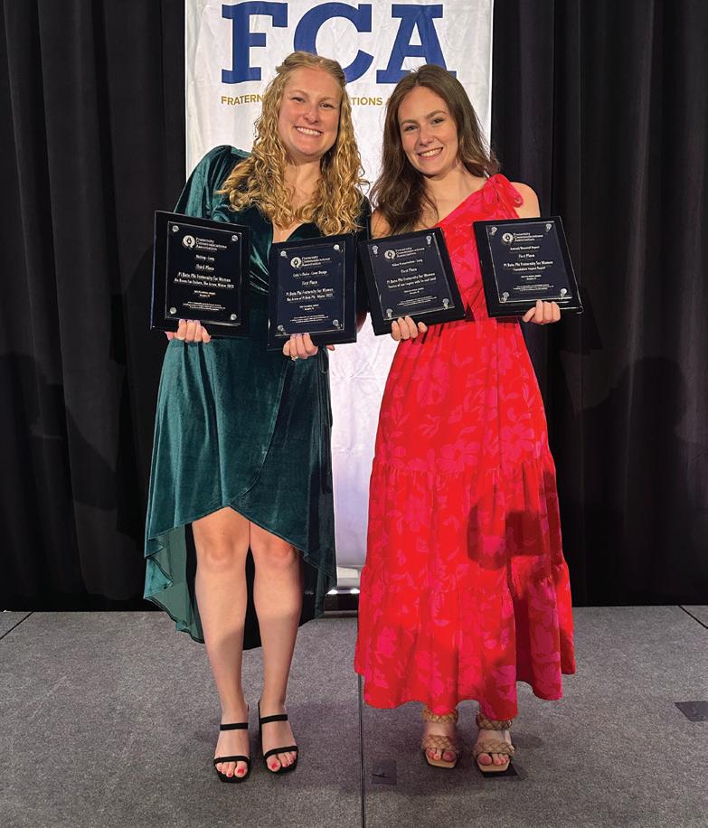 From left: Michigan Gamma CASSIDY NIEVES, HQ Marketing Director, and Maddie Mitchell, HQ Graphic Designer, accept the FCA awards on behalf of the Fraternity Headquarters' Marketing and Communications team.