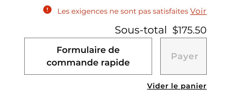 Le minimum de commande est de 150 $ en tout temps avant taxes. Si vous n’avez pas le montant minimum dans votre panier vous n’aurez pas accès au paiement.