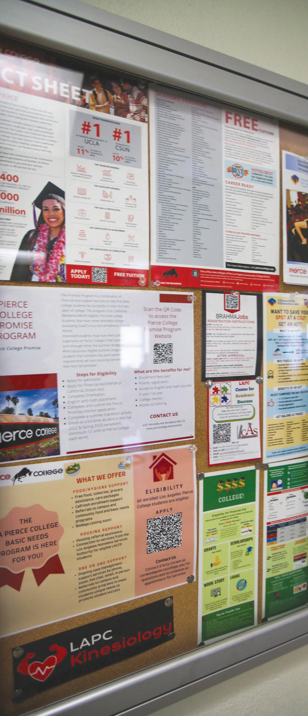 A bulletin board with flyers at Pierce.