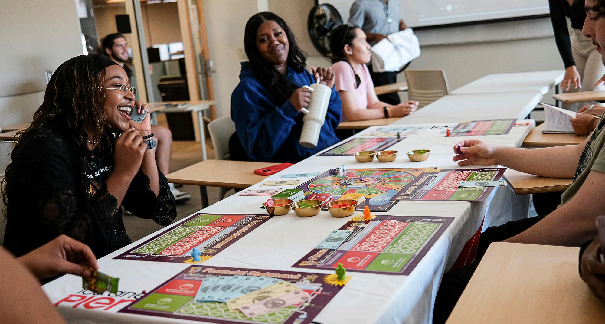 LEFT: Students Larae Jorgoo and Lyana Jackson play a financial literacy game during the Cash Flow Game Day event in the Multicultural Center at Pierce College in Woodland Hills, Calif., on Oct. 7, 2024.
