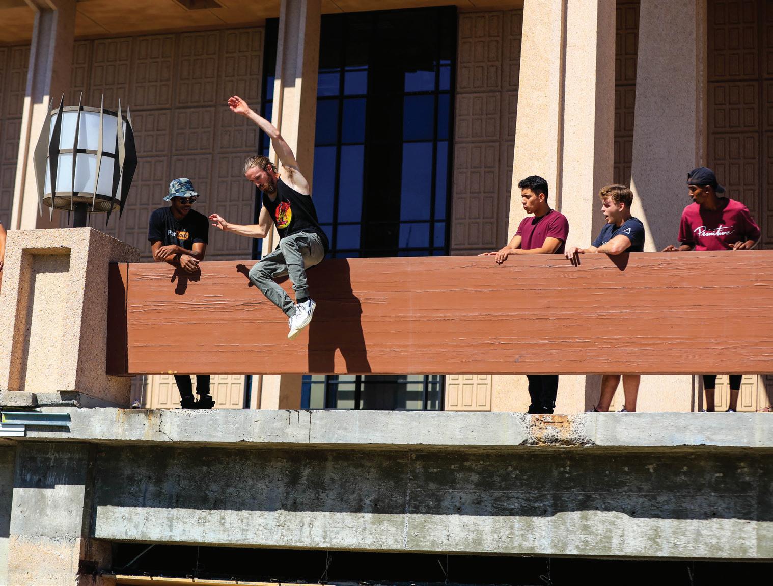 It started with simple warm-ups; small jumps to clear, vaults off a tree and safety landings from one ledge to another. It soon escalated into climbing onto a temporary walkway through construction and then over a guardrail at the California State University, Northridge Library balcony.