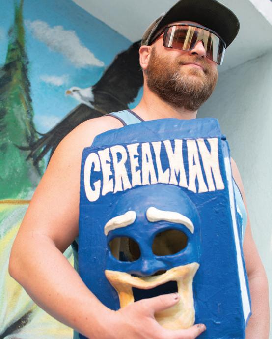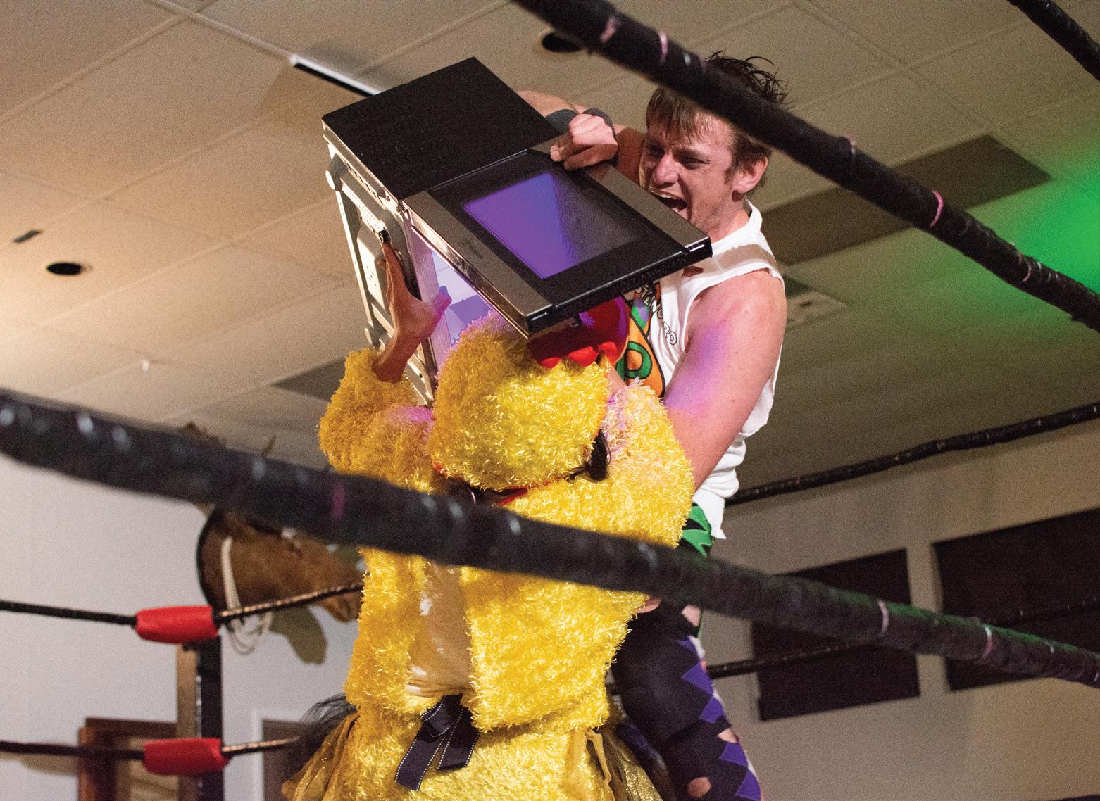 The mad scientist, Finch, sticks Chick-A-Dee’s head into a microwave during their match at WPW’s event, Backsplash, in Burbank, Calif., on Sept. 24, 2021. Sasquatch is one of the many characters you might encounter at a WPW event. King Dezi celebrates with his minotaur after retaining his championship title. Derek Smith helps with handling everything at WPW. He wrestles, sets up the ring, promotes and designs costumes.