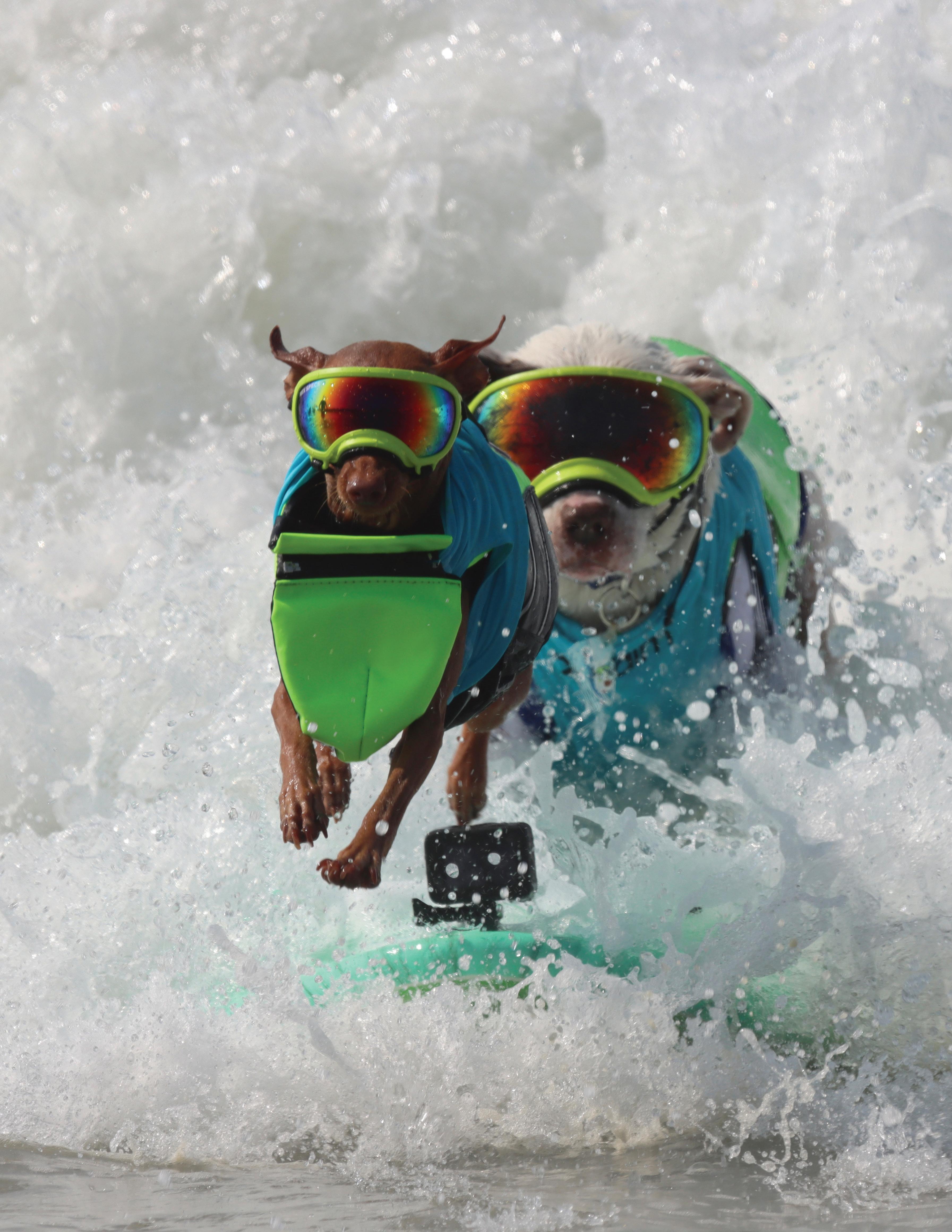 Rusty (front) and Faith ride on a surfboard in the “Surf City Surf Dog” event in Huntington Beach on Sept. 25, 2021.