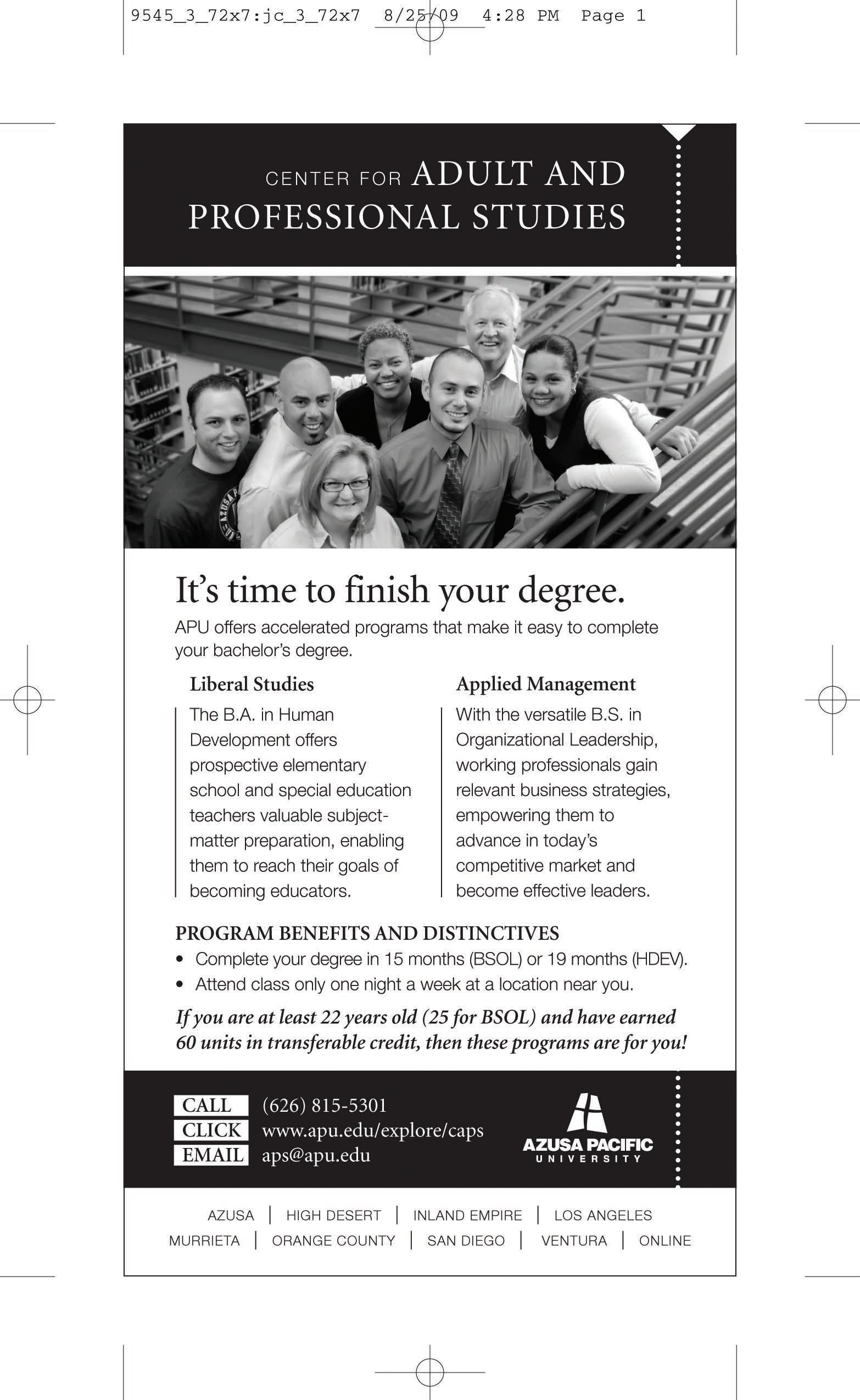 Financial Aid is available to those who qualify Degree programs, delivery options, and start dates vary by campus. Argosy University is accredited by the Higher Learning Commission and a member of the North Central Association (30 North LaSalle Street, Suite 2400, Chicago, IL 60602, 1.800.621.7440, www.ncahlc.org).  Phone/Dept.  Ad Key  Address  Website  Programs  School  Programs  Phone  Web  Ad Key  Dept.  Slug  Sign  Spot Proof Due Ad #: 105419-b-10916-6x6 Deadline First Run: Publication: Section: Specs: 6  Approved  Approved  Revise Initial _________ Flexibility. Balance. Growth. Solutions. Explore your career interests to the fullest. Stay on track Pending legislation and budget cuts in california could make getting your degree more difficult. Argosy University offers opportunity for students wanting to earn their degree in California. We have campuses in Orange County, Inland Empire, Los Angeles, San Diego and San Francisco Bay Area. Argosy University can help you meet your educational goals. Learn more – contact Argosy University. 1.877.851.9065 WWW CLICkArgOSy.COm argosy University administration 205 N. michigan Ave., Suite 1300 | Chicago, IL 60601 BACHELOR’S | MASTER’S | DOCTORATE JOB BOARD Do you need extra cash for books, college fees or rent? Join our call center for FT & PT hours in the evenings (after training) Conveniently located in Chatsworth Outbound Telephone Sales Reps Apply Now Limited Space Available! • Fun and casual work environment • Performance Commissions • Medical, dental, and 401k benefits • Merchandise discounts at Sears & Kmart $12.50 hourly rate plus commission bonuses. We are looking for individuals with a competitive drive, energetic style, highly motivated personalities and sales drive, who are interested in working in a fun and energetic environment. Prior experience a plus; Bilingual: English/Spanish a plus. Shifts available 2-9pm, 5-9pm, Saturdays 5am-4pm, Sundays 7am-4pm 9332 De Soto Avenue, Chatsworth, CA 91311 Send resume to fax or e-mail to Maria.Valenzuela@searshc.com or call for interview information Tel. 818.885.3000 Fax. 818.885.3037 EOE/AA Background check/drug screen conducted