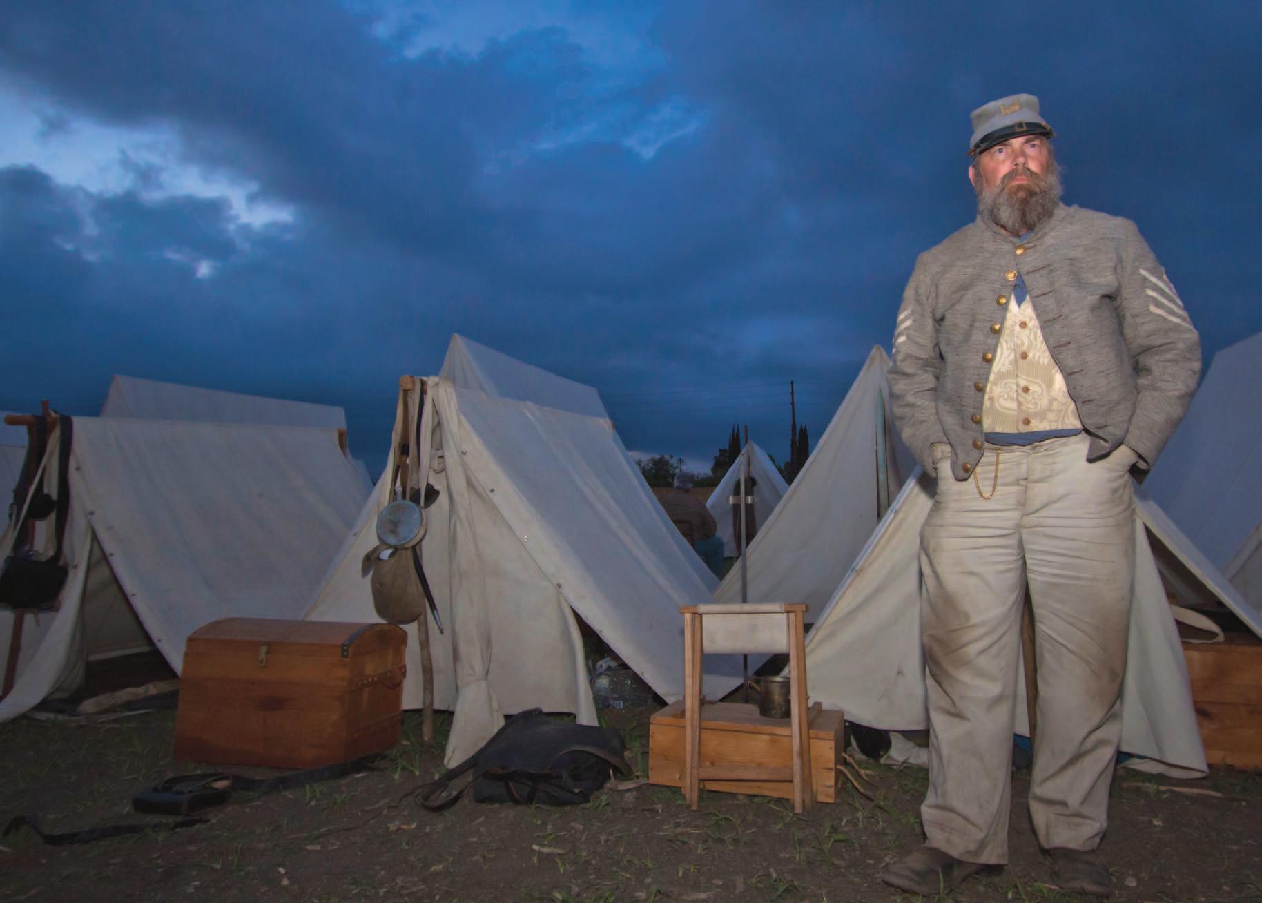 Top: A Confederate colonel stands outside of his tent after a hard day of fighting and a long night of drinking in a Civil War reenactment at the Pierce Farm Center. Left: Dr. Malarkey demonstrates how an amputation was performed during the Civil War, using medical pliers to remove a bullet, to a crowd of visitors during Heritage Days at the Pierce Farm Center May 15.