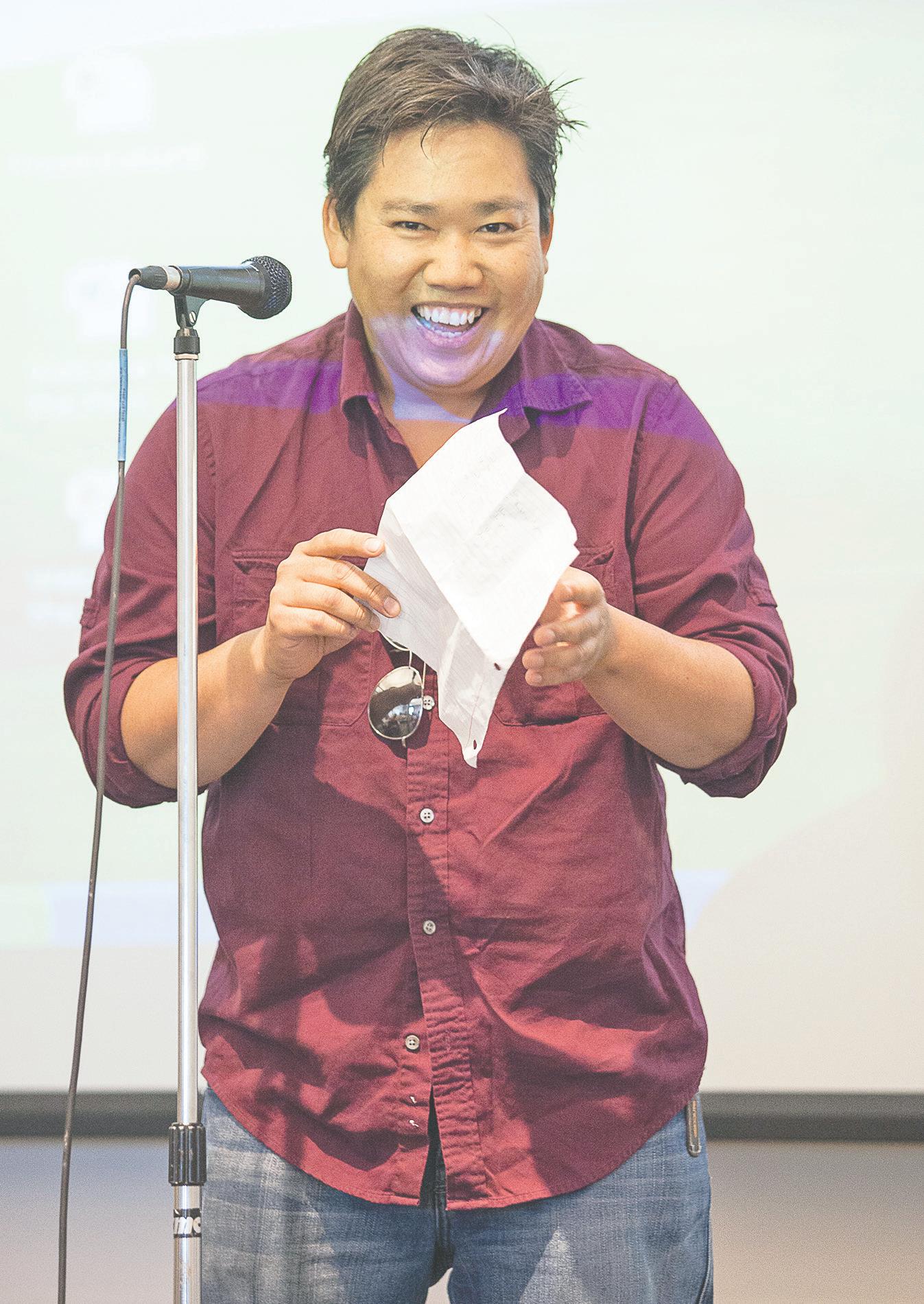 Clockwise from top left: Youttana Makaratad reads a poem that he created from the writing he found in bathrooms. Abdullah Alawaji speaks about a film he is going to show about his homeland of Saudi Arabia.
