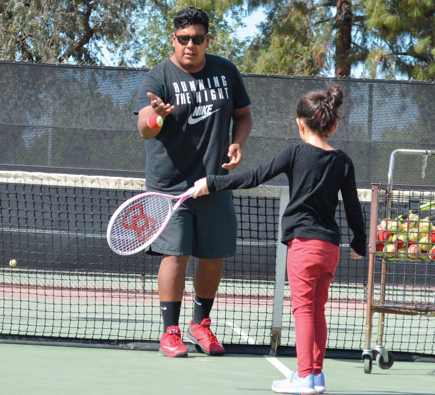 Third year music major student, Daniel Barrera, 24, teaches tennis lesson to Aila Farkhan, 5, at Balboa Sport Center on Monday, March 28.