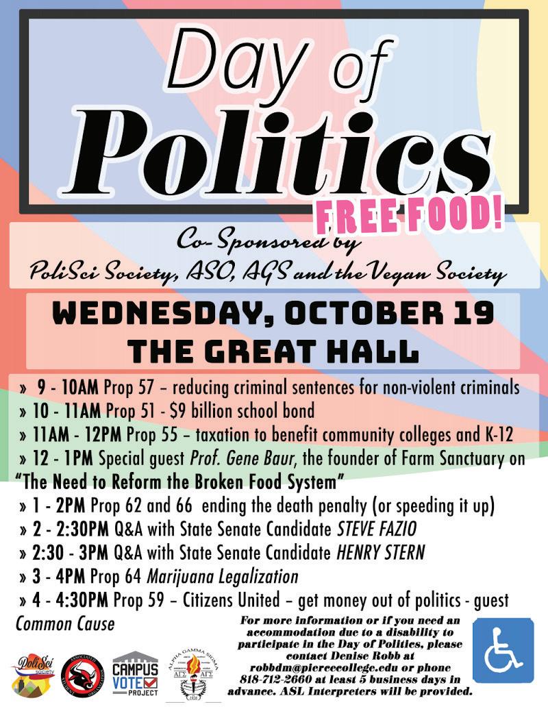 PIERCE COLLEGE WILL BE HOSTING A DAY OF POLITICS [REFER TO PAGE ONE.] THE ROUNDUP HAS COMPILED ALL THE PROPOSITIONS THAT WILL BE ON THE CALIFORNIA BALLOT. TAKE THIS VOTERS' GUIDE INTO THE BOOTH WITH YOU TO REMEBER WHAT YOU PLANNED ON VOTING FOR. THE LAST DAY TO REGISTER TO VOTE IN CALIFORNIA IS OCT. 24.