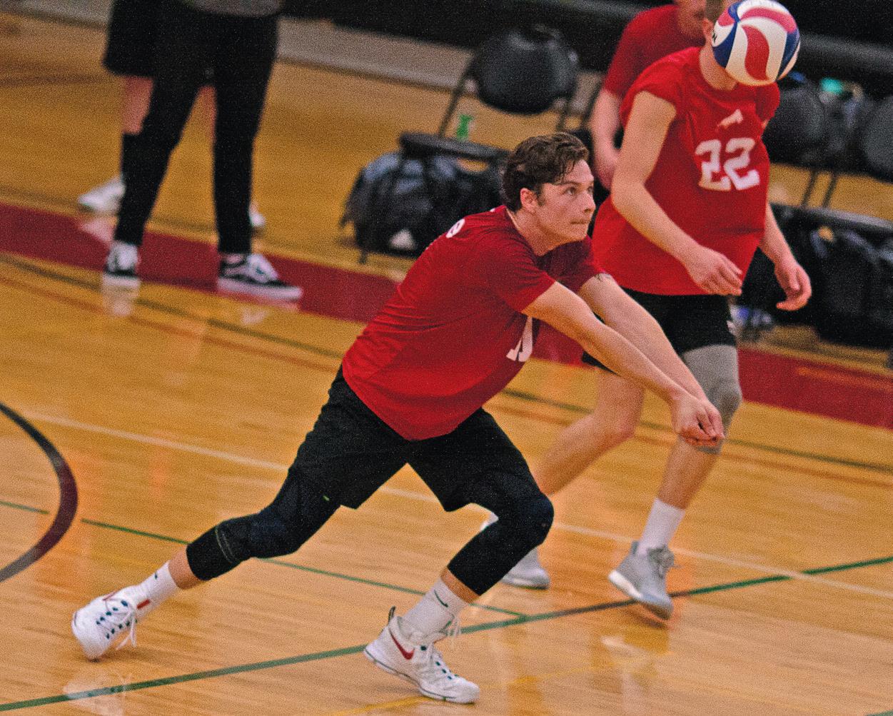Grant DeGrasse receives the serve against Golden West College during the fourth set on Mar. 8 in Woodland Hills, Calif. The Brahmas won in four sets.