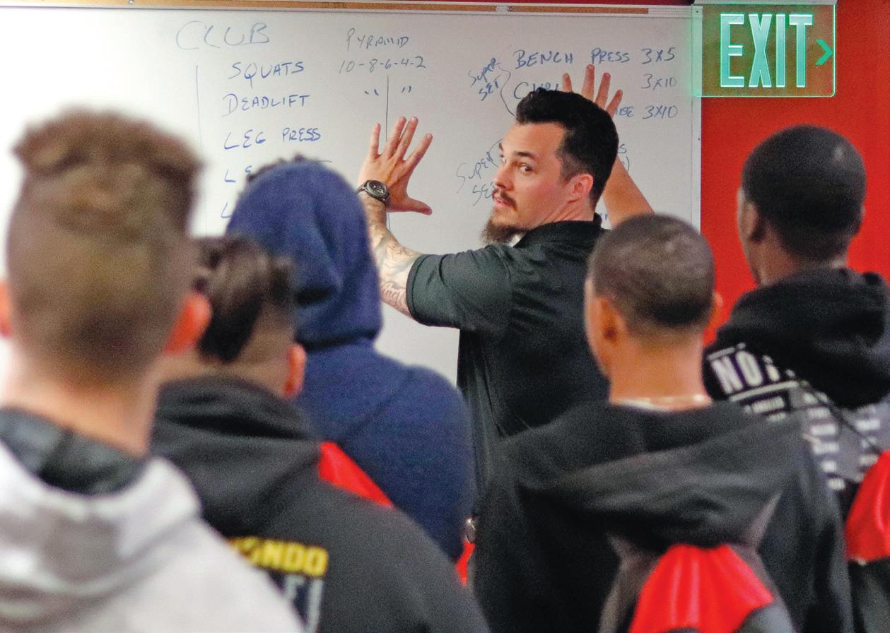 Conditioning Coach Dylan Flannery talks to the prospects about football's strength and conditioning program on Prospect Day at Pierce College in Woodland Hills, Calif. on Mar. 9, 2019.