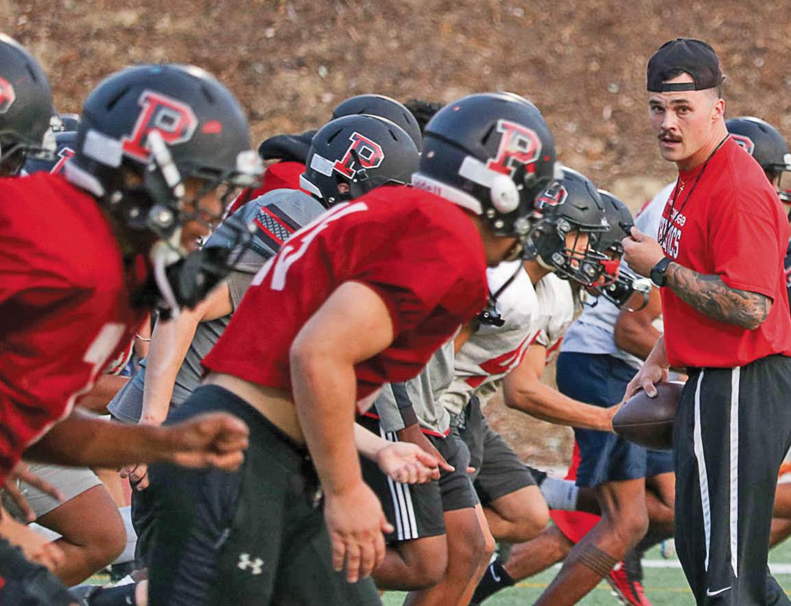 Head strength and conditioning coach Dylan Flannery looks to the sidelines during a Pierce College football practice at John Shepard Stadium, in Woodland Hills, Calif. on Sept. 26, 2019
