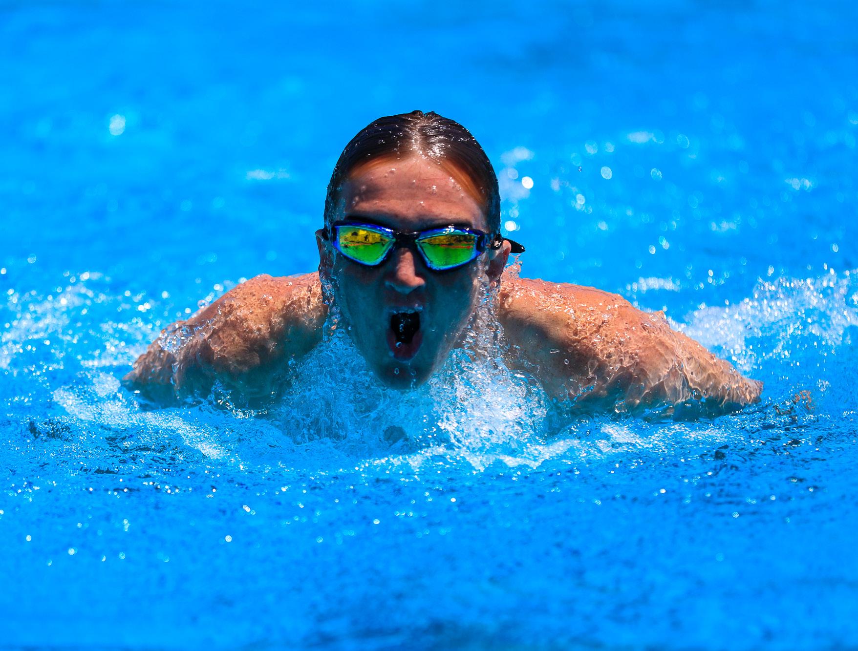 Trace Newman swims during an in-person athletic conditioning session at Steven Schofield Aquatic Center on May 3, 2021.