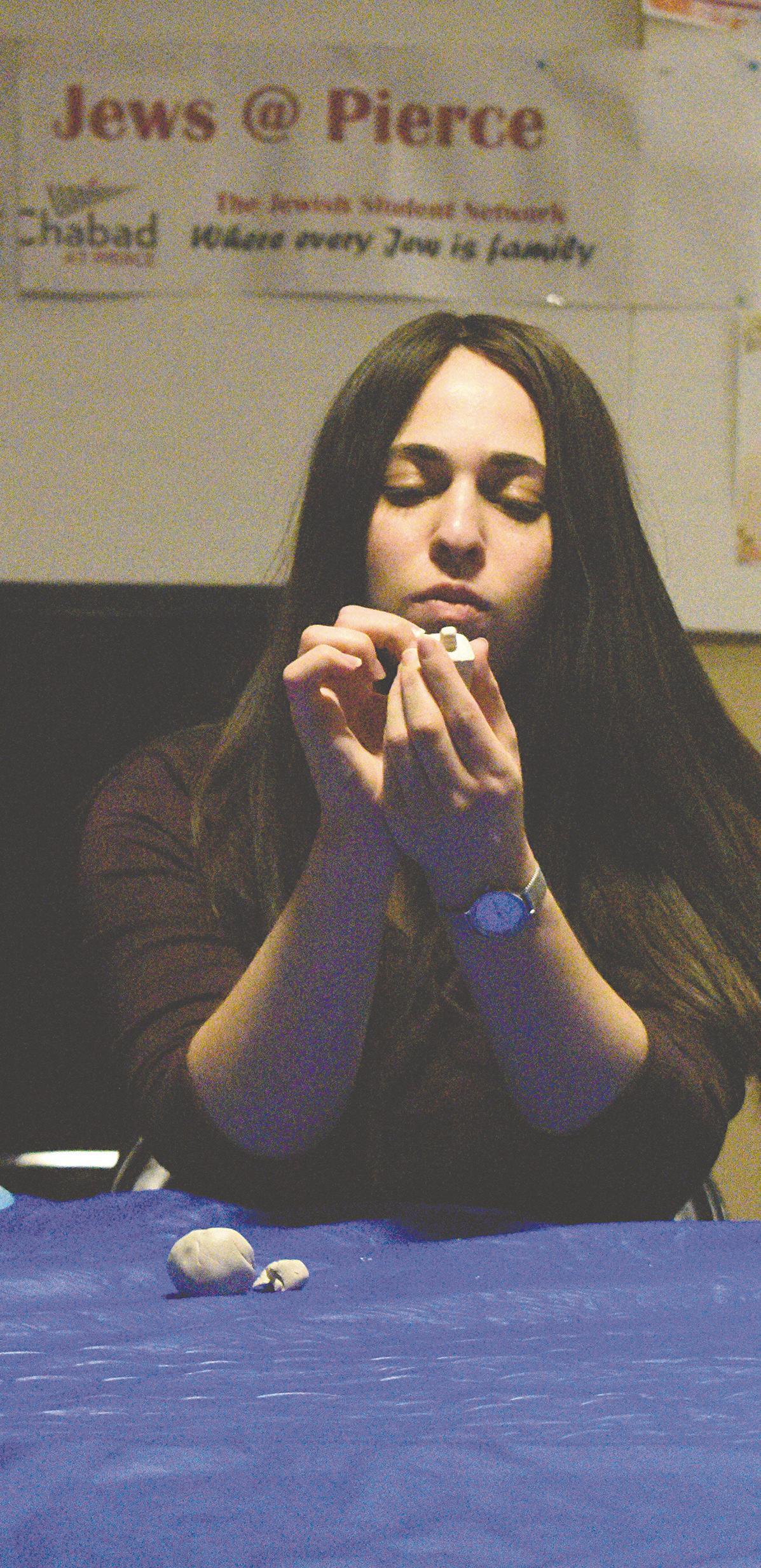 Mushka Kluwgant makes a dreidel from clay at a Chanukah event at in Woodland Hills, Calif., on Dec. 1, 2021.