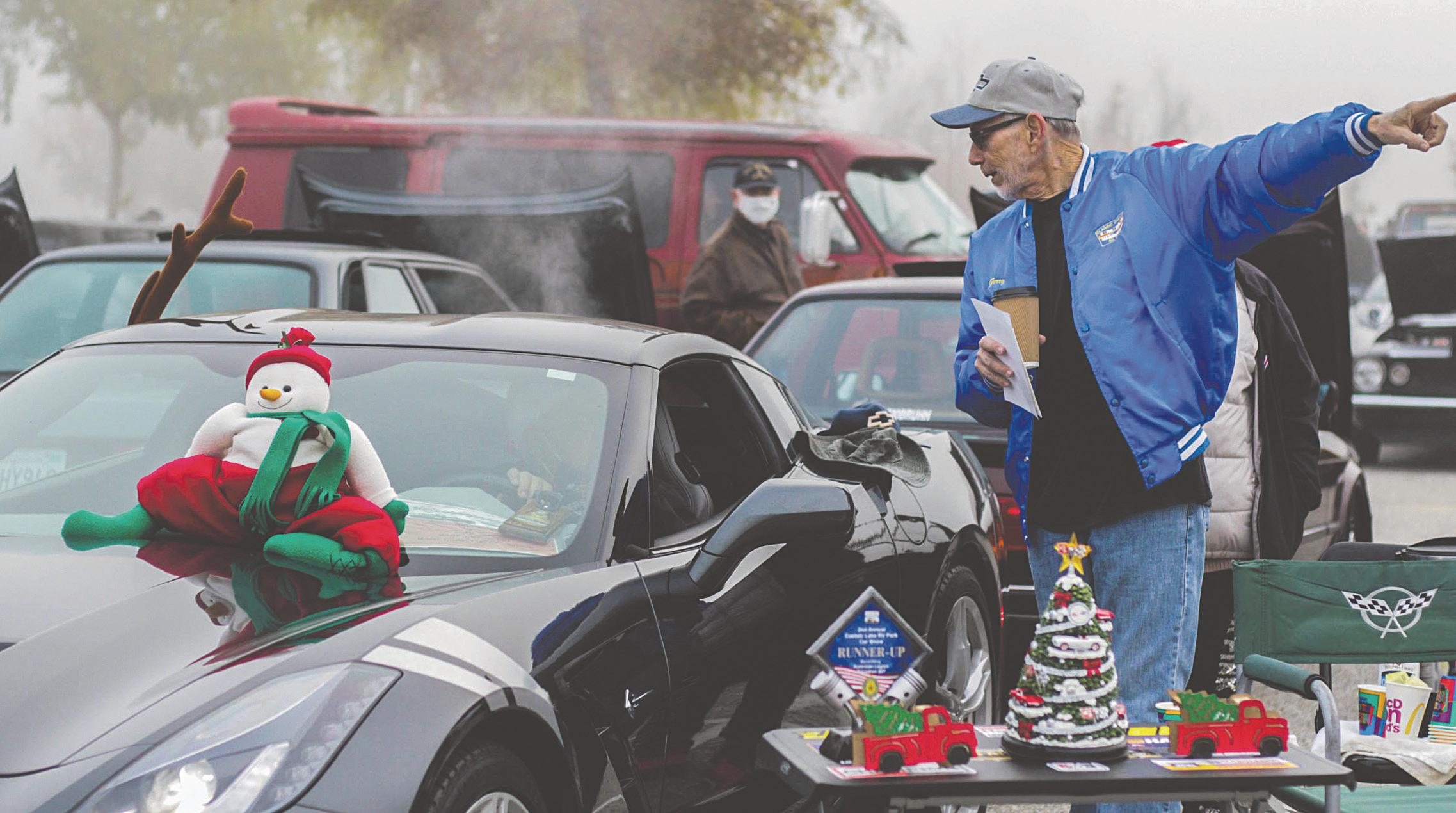 Gerry Wasson points toward the donation table at the Motor4Toys event in Lot 7 at Pierce College in Woodland Hills Calif., on Dec. 5, 2021.