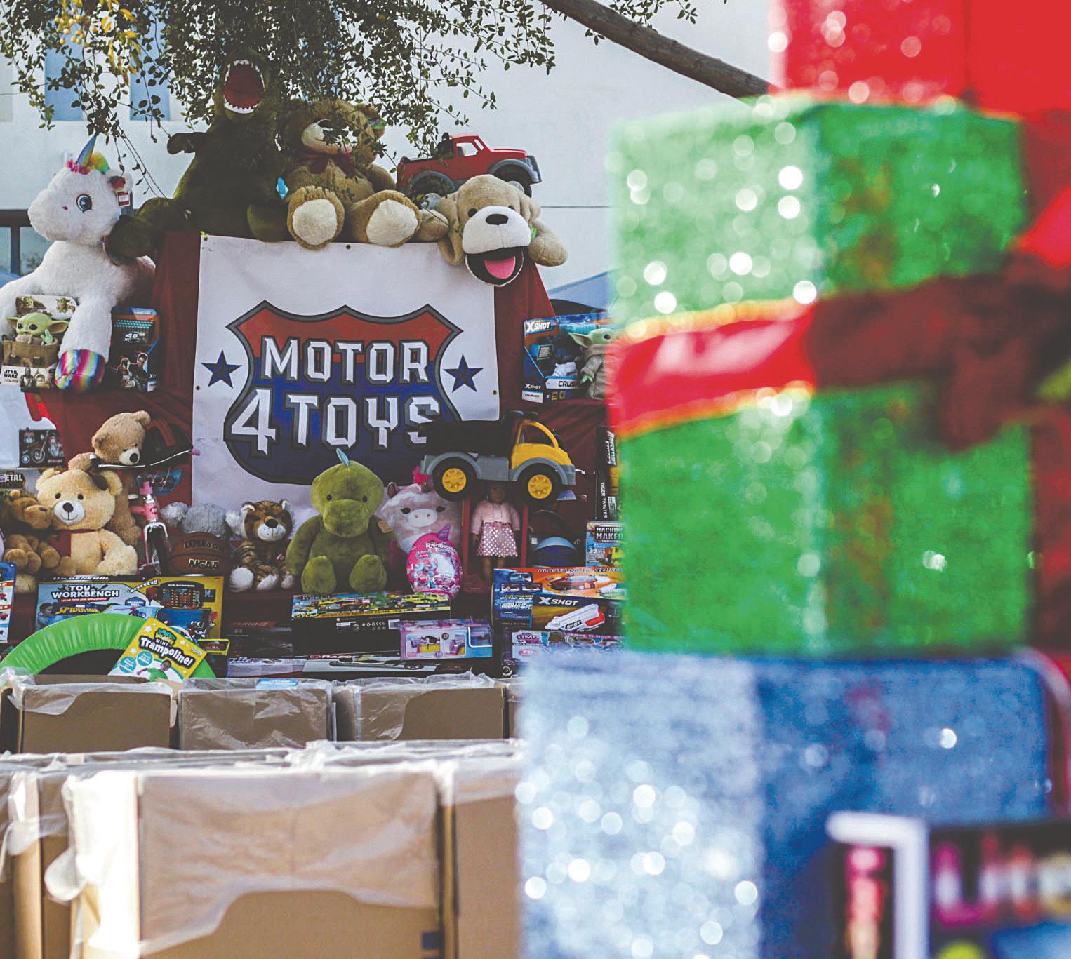 The donation table is filled with toys at the Motor4Toys event in Lot 7 at Pierce College in Woodland Hills, Calif., on Dec. 5, 2021. Photo by Trisha Anas.