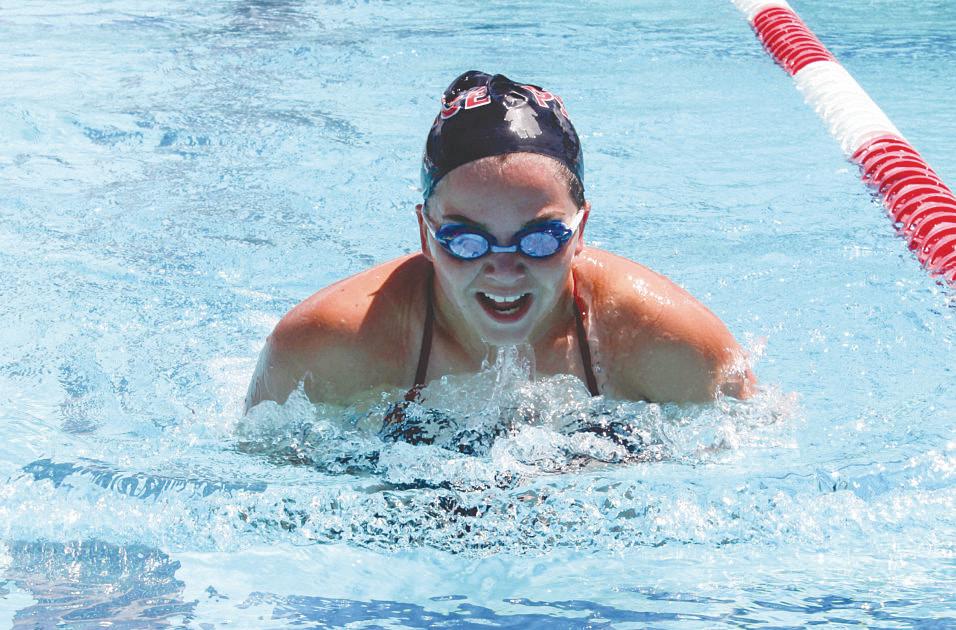 File Photo by Navodya Dharmasiriwardena Pierce College swim team member Cassidy Hoffman warms up with the breaststroke at the Steven E. Schofield Aquatic Center at P ierce College in Woodland Hills, Calif., on April 16, 2018.