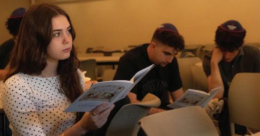 BOTTOM RIGHT: (Left to right) Child Development major Ariel Hanina, Political Science major Adam Naim and Business Administration major Armon Sanders listen to Rabbi Aaron Greene read scripture from The Book Of Esther at the Chabad Club Purim event in the Great Hall at Pierce College in the Woodland Hills, Calif., on Tuesday, March 3, 2026.