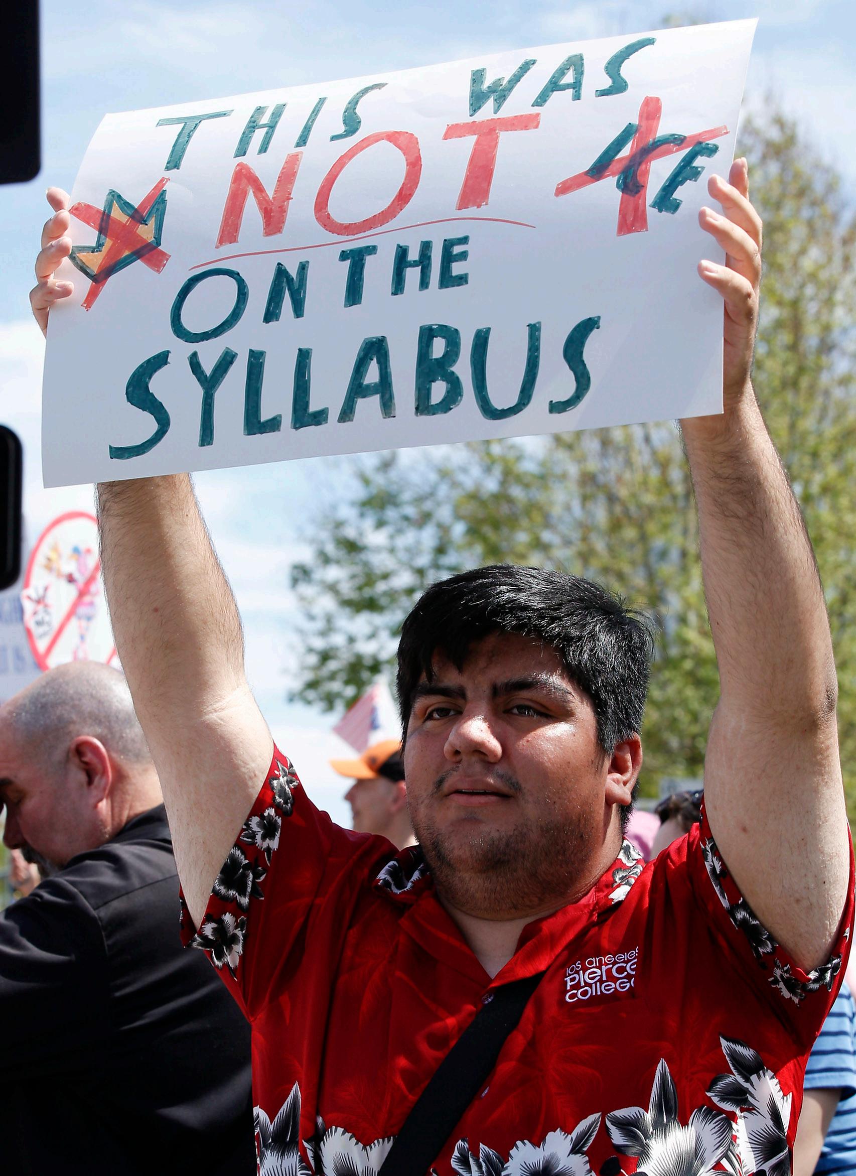 Joseph Evans, a Pierce College alumni, holds a sign at the “No Kings” rally on Saturday, March 28, 2026 in Woodland Hills, Calif.