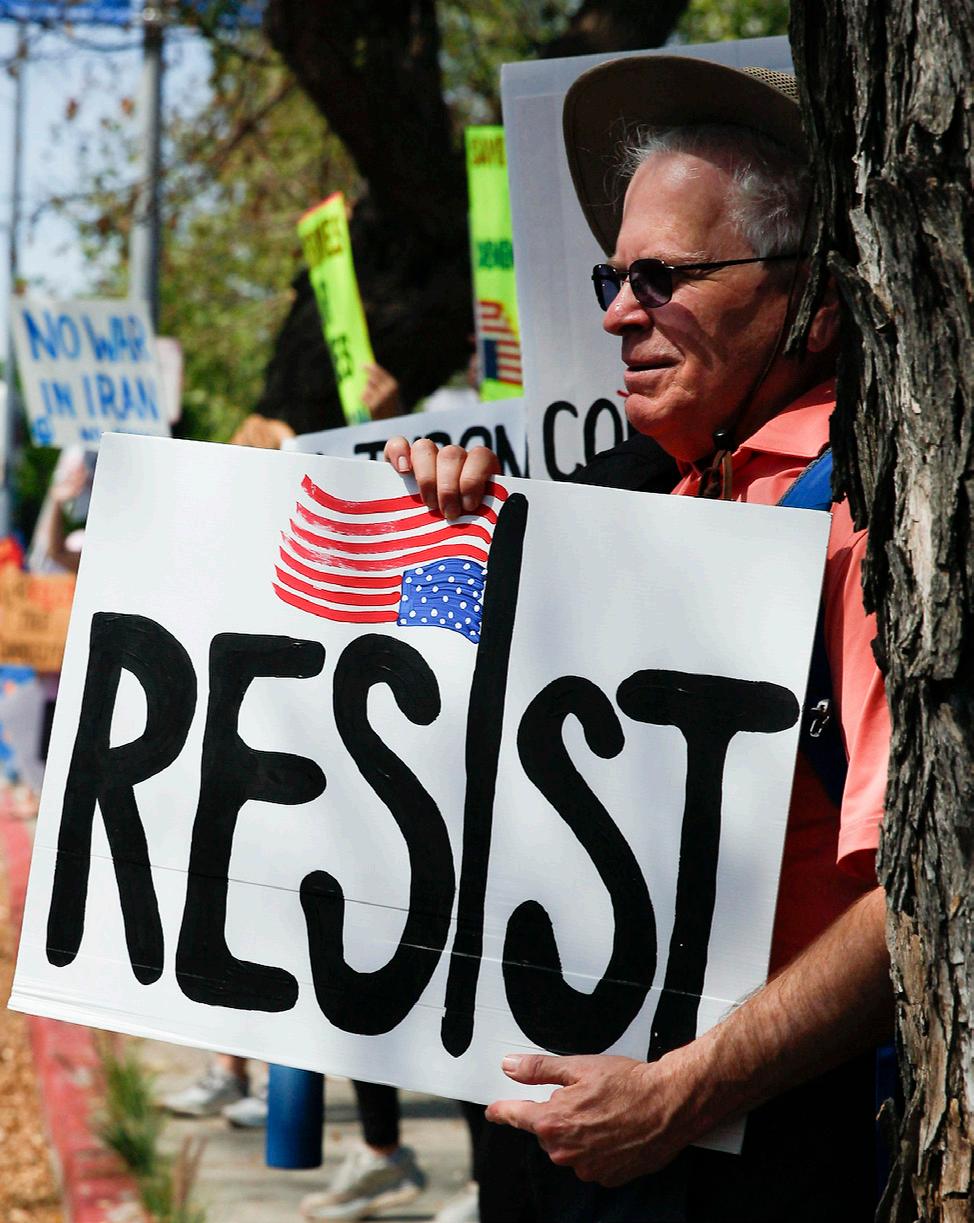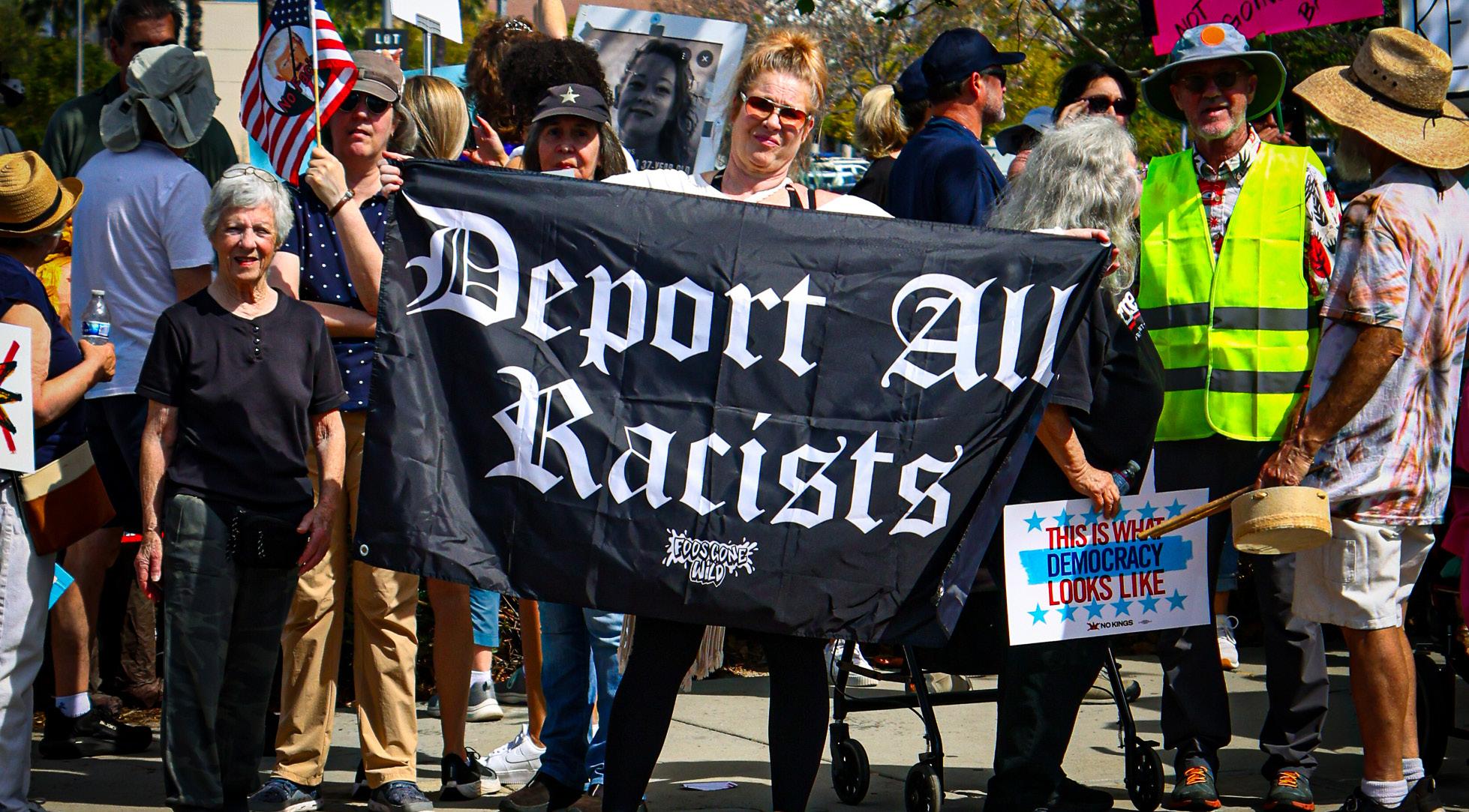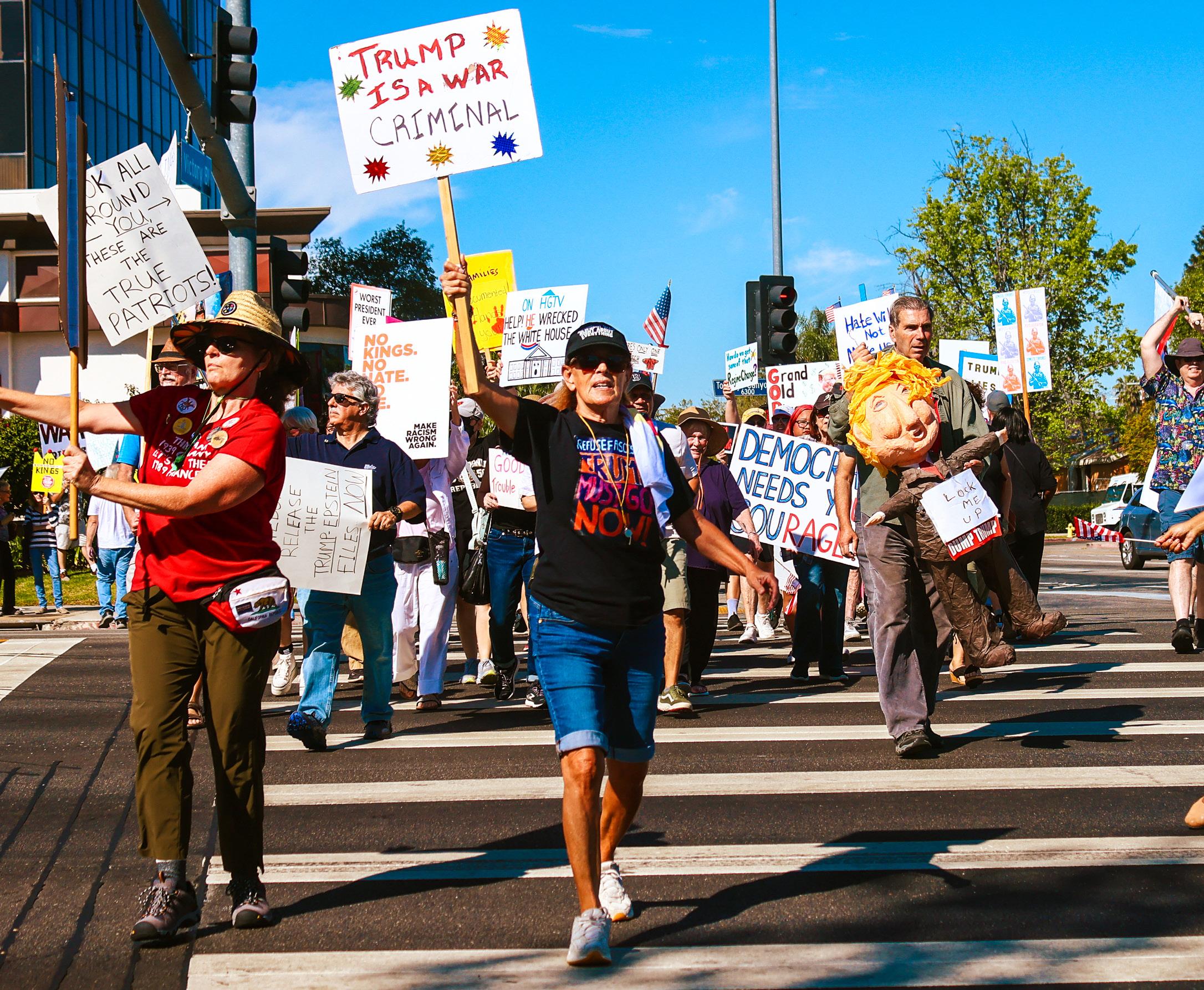 TOP: Protestors hold signs and cheer during the “No Kings” rally in Woodland Hills, Calif. on March 28, 2026. Photo by Jake Gregory.