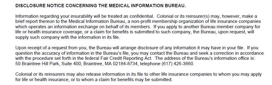 Health information may be disclosed by any health care provider or institution, health plan or health care clearinghouse that has any records or knowledge about me including prescription drug database or pharmacy benefit manager, or ambulance or other medical transport service. Health information may also be disclosed by any insurance company, Medicare or Medicaid agencies or the Medical Information Bureau (MIB). Health information includes my entire medical record, but does not include psychotherapy notes. Non-health information including earnings or employment history deemed appropriate by Colonial to evaluate my application may be disclosed by any person or organization that has these records about me, including my employer, employer representative and compensation sources, insurance company, financial institution or governmental entities including departments of public safety and motor vehicle departments.