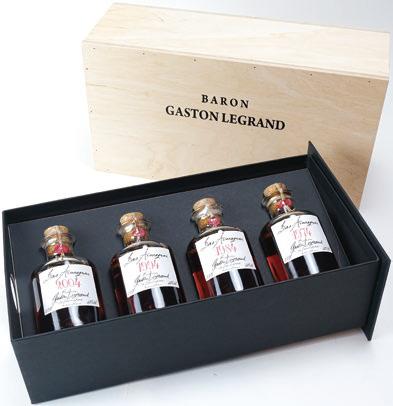 プティット・シャンパーニュの1993年ヴィンテー ジを含め、年代や製法の異なる3種類のコ ニャックに、洋梨のアロマが漂う15年熟成 のピノー・デ・シャラントを専用箱に詰めて。