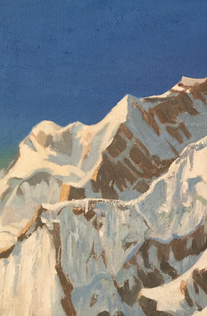 the summit, and the famous Yellow Band of marble and quartzite rock below the summit. Also depicted are what is now known as the Norton couloir to the left of the summit and possibly also some of the rock pinnacles of the north east ridge. Everest from Rongbuk was in Somervell’s personal collection at the time of his death and must have been his favourite painting of this view. His widow subsequently exhibited it in 1976 and again in 1979 when Noel Odell was photographed inspecting the picture. It remained with the Somervell family for almost 100 years until sold at auction in 2021.