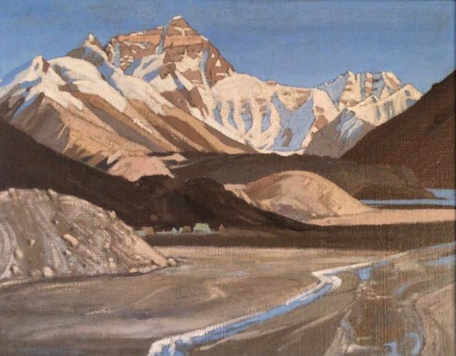 A great source of influence on Somervell was the Russian painter, explorer and mystic Nicholas Roerich (1874-1947). Somervell described him as '...the greatest mountain painter alive...'. Roerich travelled through India and North America in the 1920s before settling in Kulu where Somervell stayed at his house for a few days in September 1944. Somervell wrote: ‘Did several rough sketches, no time for paint. The most glorious day, views, shapes and colours of mountains etc’.