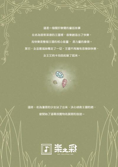 在名為里斯萊德的王國裡,音樂創造出了快樂,而快樂是整個王國的核心能量,是力量的象徵。某日,女 巫葛瑞絲奪走了一切,王國不再擁有音樂與快樂,女王艾莉卡也因此躲了起來,這時,名為潼恩的少女站 了出來,決心拯救王國的她,便開始了這尋找寶物而展開的旅途- 故事背景設定在一個虛構的童話(音樂)王國,王國名為里斯萊德。生活在此的人們都很擅長演奏樂器,樂