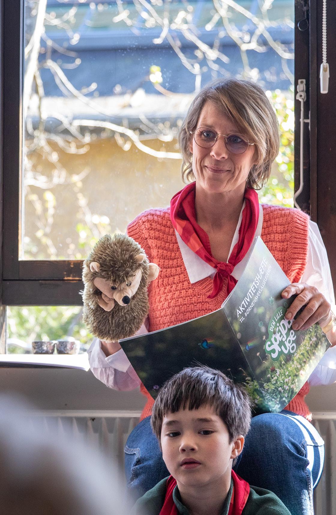 I spejderrygsækken finder du hånddukken Pia Pindsvin – Den lille spejderuges maskot. Hun spiller hovedrollen i højtlæsningshistorien, som introducerer dagen og samler op til sidst. Pia Pindsvin har også sin helt egen sang, som dine elever kan lære op til spejderugen, så I kan synge den, når klassen er på vej ud i naturen. Du finder lydfil, sangtekst og noder på Den lille spejderuges hjemmeside.