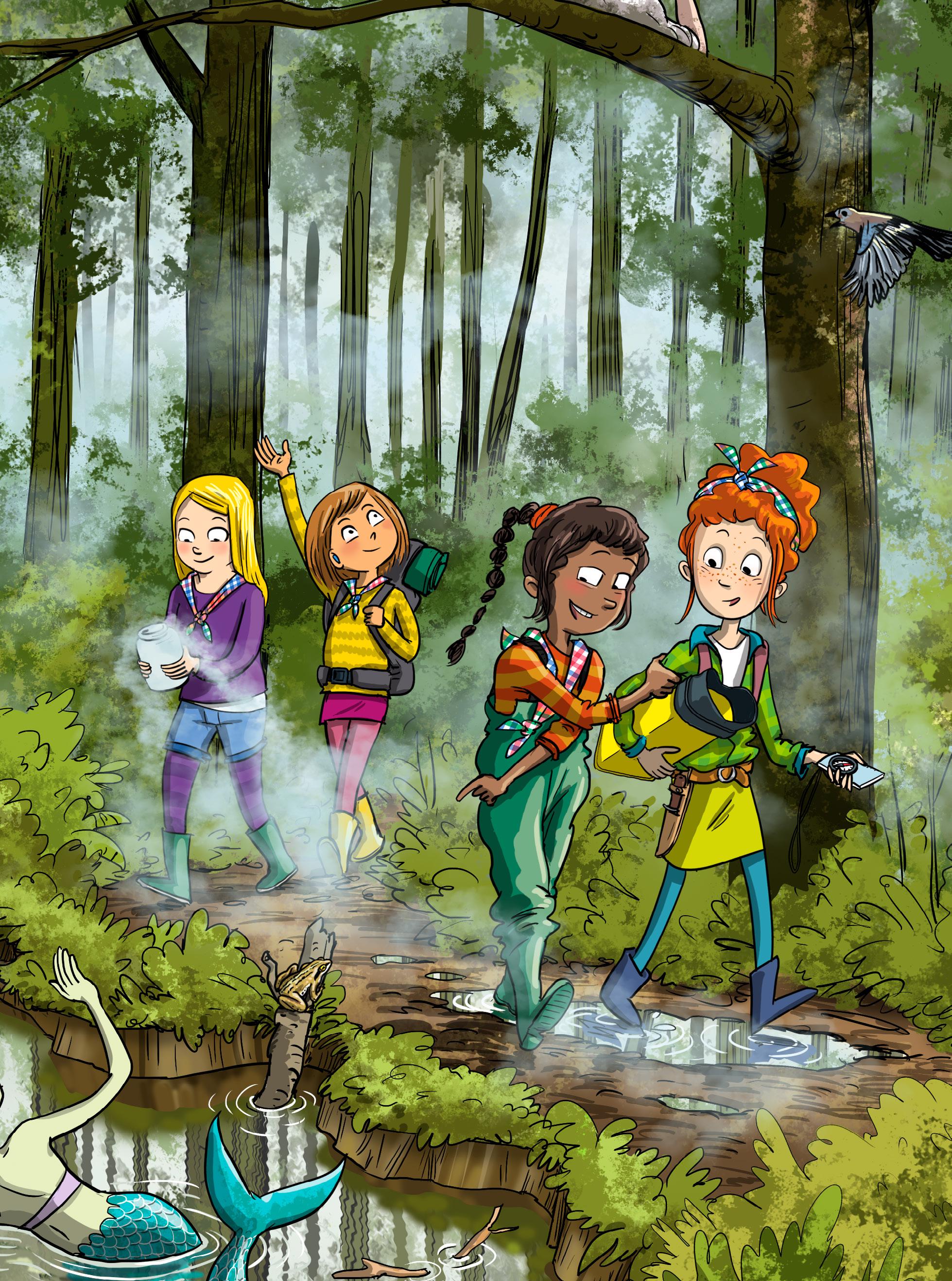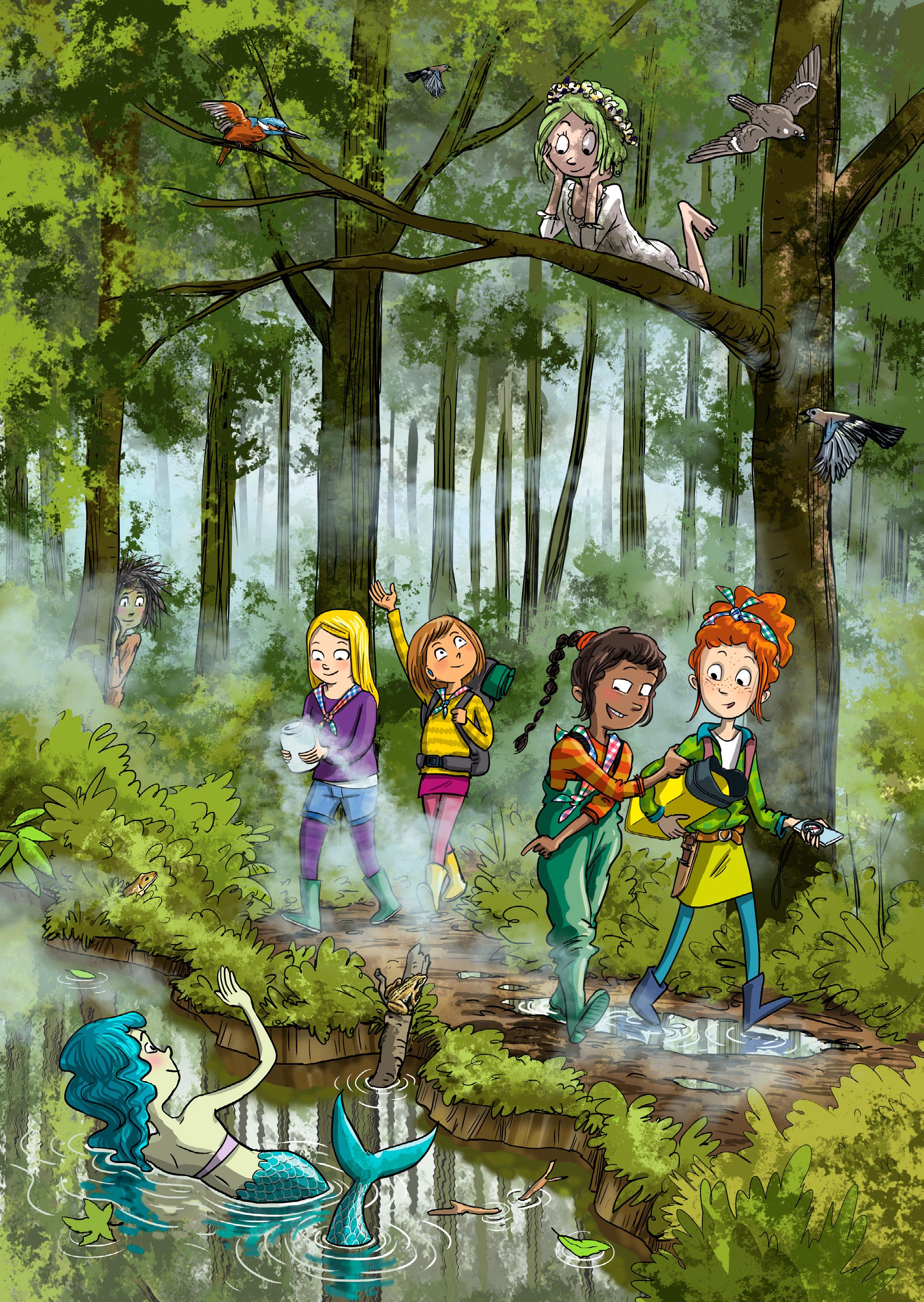 Da de har ligget lidt tid i skovbunden, hører de pludselig en lys latter i det fjerne. Det er hverken Flora, Kat, Sofie eller Mille, der griner - lyden kommer henne fra vandløbet. De rejser sig og følger nysgerrigt lyden, gennem det høje græs og ned til bredden.