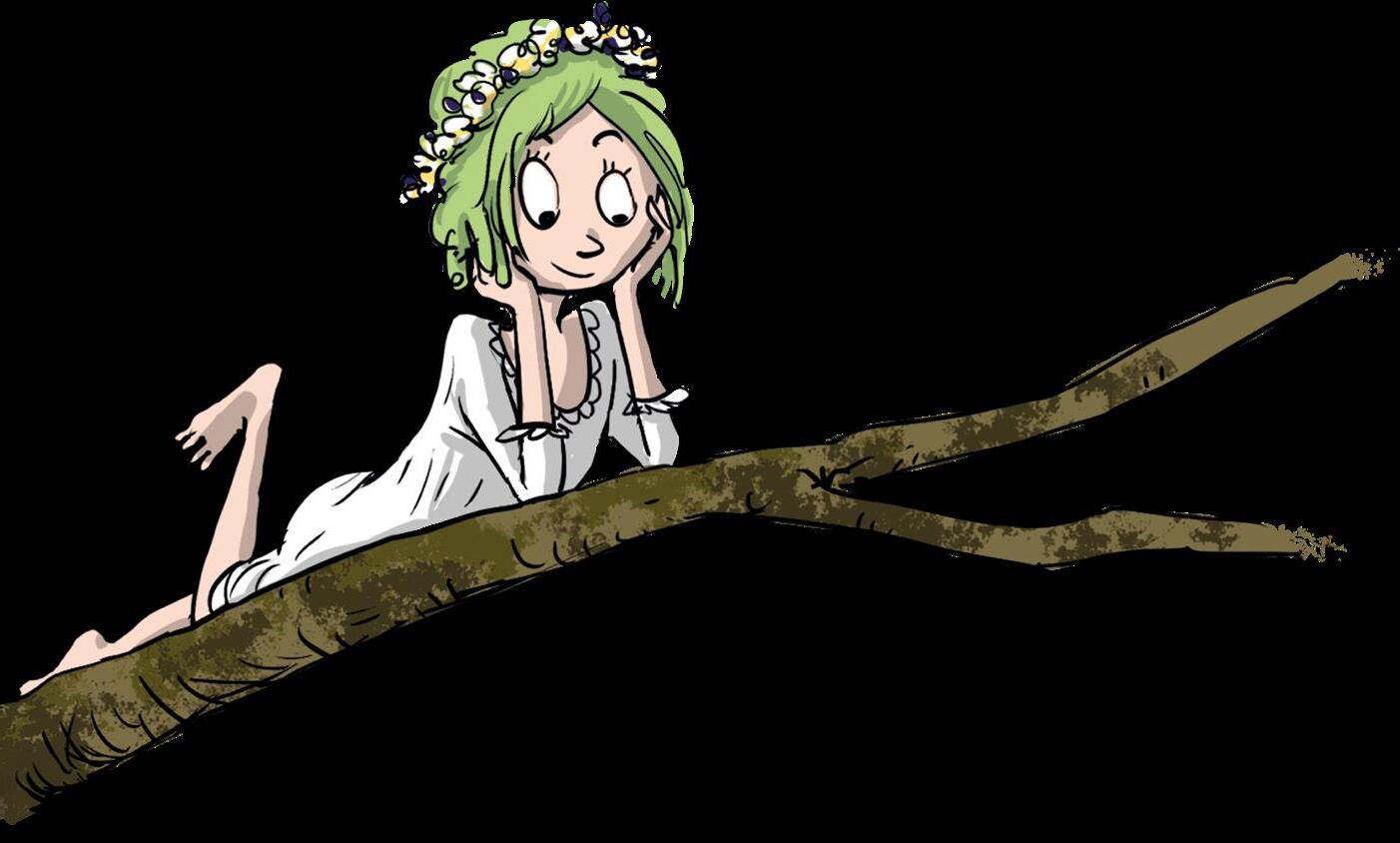 Og der, midt på en glat sten, sidder en pige med langt, sølvskinnende hår. Hendes øjne glimter som morgensol på vand, og hendes kjole er vævet af blade og de smukkeste blomster.