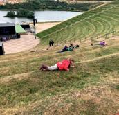 Vi triller ned ad bakken ved amfiscenen. Den første dag gik vi en tur på hele lejren for at se, hvor stort der var.