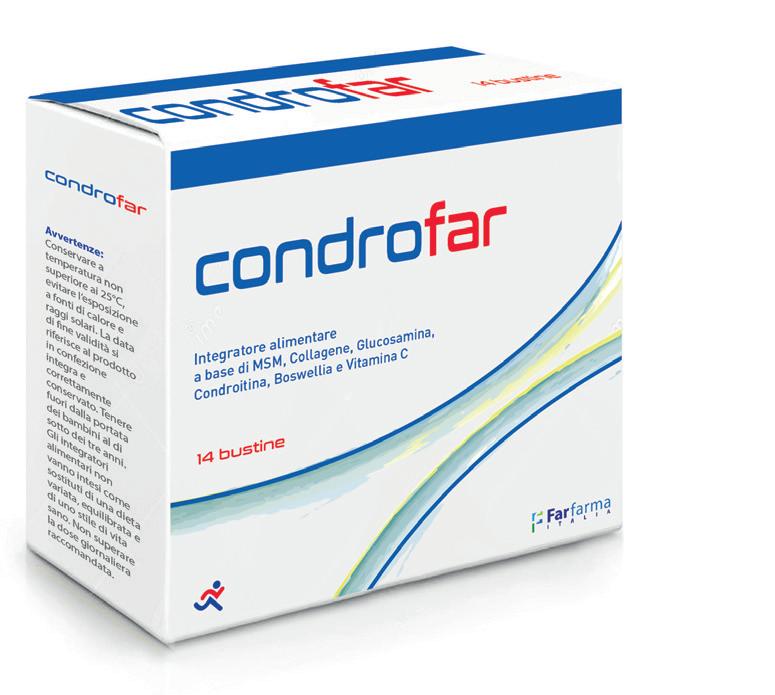L’artrosi è una malattia provocata da una progressiva degenerazione della cartilagine articolare e del liquido sinoviale. Tale involuzione provoca sintomi come rigidità e/o dolori, specie mattutini, che aumentano con l’età. È importante cercare di contrastare questa lenta degenerazione articolare apportando nutrienti per la cartilagine e svolgendo una adeguata attività motoria in scarico articolare. Condrofar è un integratore alimentare a base di elementi che contribuiscono alla normale funzionalità articolare. Agisce nella prevenzione degli eventuali danni alla cartilagine articolare nei casi in cui è richiesto un aumentato fabbisogno di tali nutrienti.