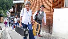 vorgeführt, die sonst nicht öffentlich zugänglich sind. Mit Lageplänen in der Hand und einem Staunen im Gesicht erwanderten die Besucherinnen und Besucher das Haufendorf. Mit einem raschen Vorbeigehen oder Hinschauen war es nicht getan. Für die alternative Hausapotheke und das Anfertigen von Kraxen galt das ebenso wie für das Weben, die Verarbeitung von Flachs, das Wildbartbinden, das „Kliabm“ von Lärchenschindeln, die Anfertigung von Holzpuppen, das Schnitzen von „KlaubaufLorvn“, die Herstellung von Körben und Flechtarbeiten oder das Seifensieden. Auch über Gegenstände, die aus Abfallprodukten angefertigt worden waren, konnte man staunen, über die Welt des Anbaus und der Verwendung von Bergkräutern oder über Kunstwerke in- und außerhalb von Gebäudemauern. Außerdem war im ganzen Dorf verstreut passende Musik zu hören. Auf dem Platz vor der Kirche zum Beispiel spielte die -Band „Kraut und Ruabm“ der Werkstatt für Menschen mit Behinderung von Prad auf. Zusätzlich zu den Ohren kamen auch die Gaumen voll auf ihre Kosten. Neben zwei Gastbetrieben warteten auch