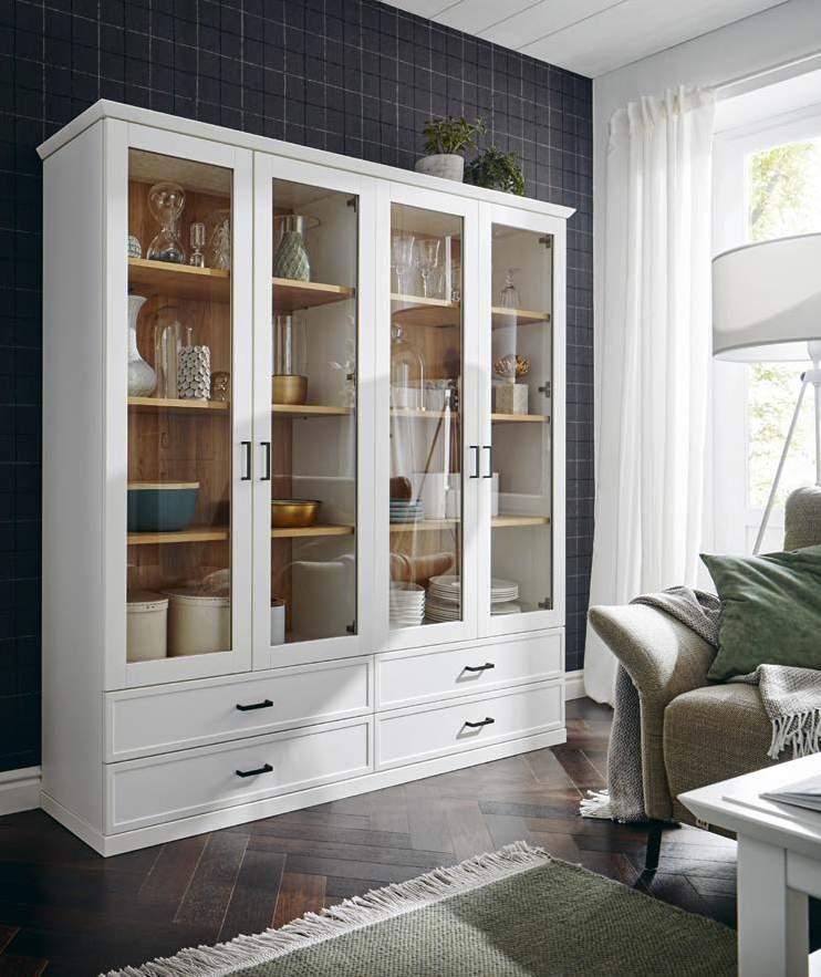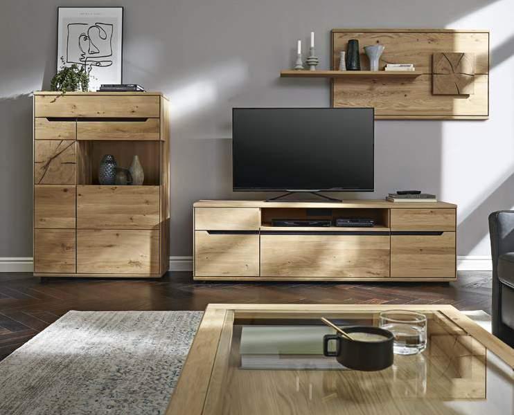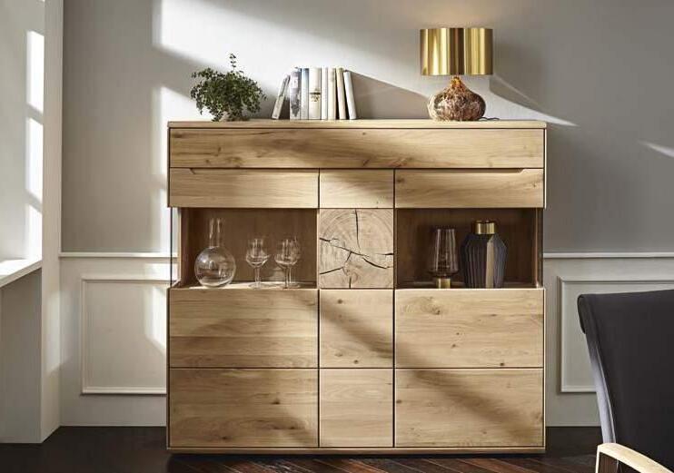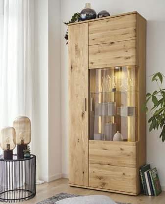 Global Lenoso, Korpus außen: Eiche Nachbildung, Fronten Eiche massiv, Glas champagnerfarben, Griffe Metall schieferfarben, Korpus innen: Erle Nachbildung:
