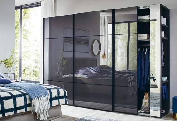 Global Libro 2.0 Schwebetürenschrank, 3-türig, Front Basaltglas glänzend, Korpus basaltfarben, Korpus innen Leinenoptik Twist, Griffleiste und Türsprossenfarbe schwarz, inkl. 1 Kleiderstange und 2 Fachböden je Element, mit Regalelement rechts inkl. 3 Fachböden, 1 Metallstange und Kristallspiegelpaneel, BHT ca. 300x223x69 cm, 1998.-*