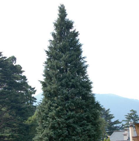 14. Cedrus deodara - Cedro dell‘Himalaya È un albero sempreverde di grandi dimensioni, alto mediamente 40-50 m, ma che può raggiungere i 60 metri di altezza e i 3 metri di diametro. La sua chioma è piramidale, con un diametro di 5-20 metri, e la cima è ricurva fin da giovane. Il tronco è unico, cilindrico e con corteccia grigiastra, che negli esemplari adulti si screpola in placche sottili. I rami sono tendenzialmente orizzontali e portano ripiani di fogliame, con caratteristici germogli apicali penduli.