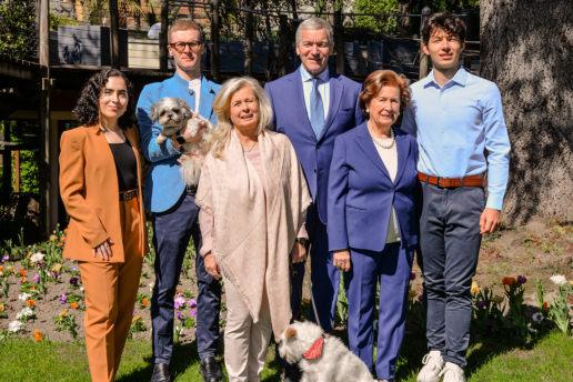Sissi, Irmgard und Lorenz Amort, Florian, Philipp und Micaela Ellmenreich mit den beiden Hunden Mochi und Gigolo
